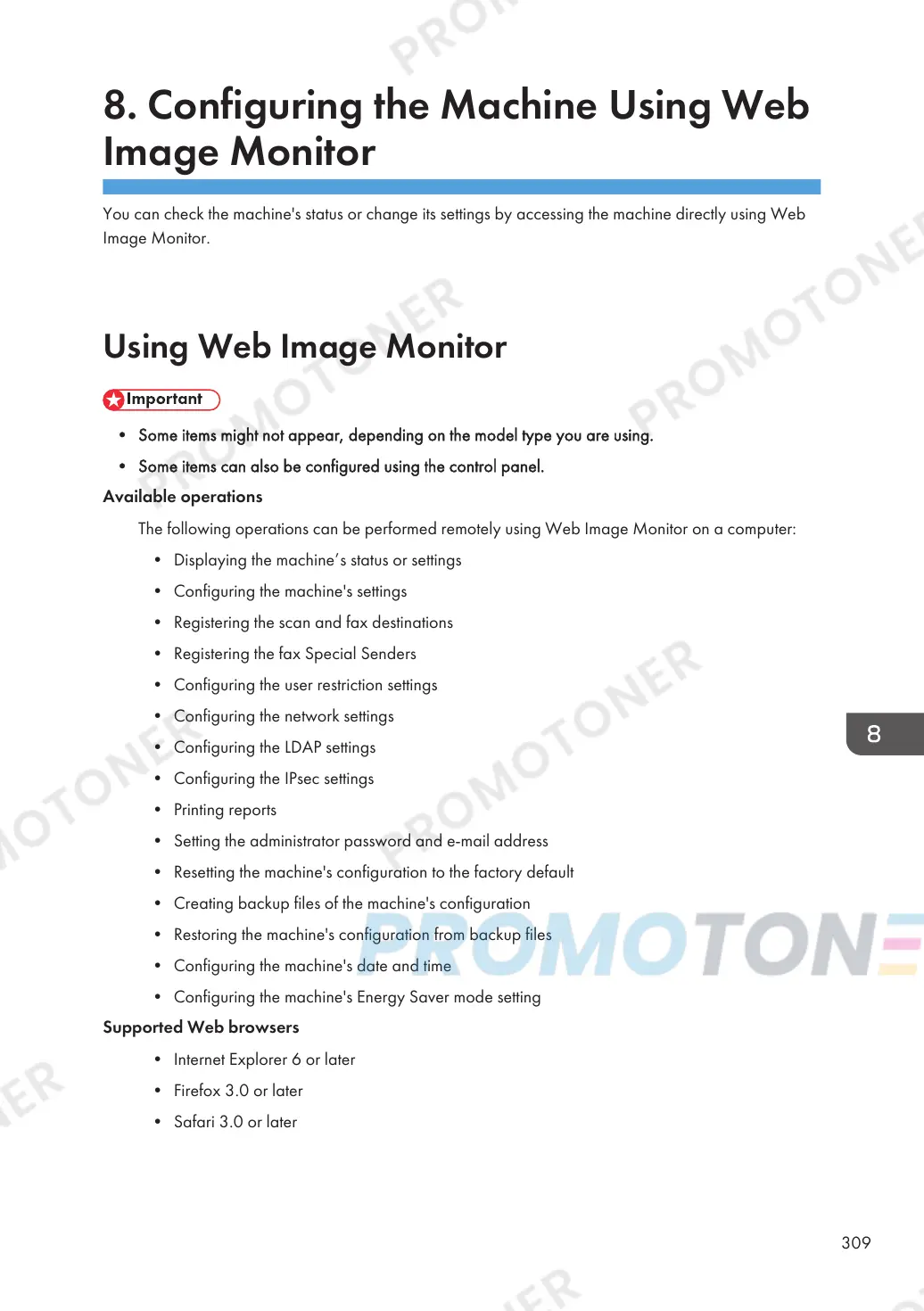 The following operations can be performed remotely using Web Image Monitor on a computer: