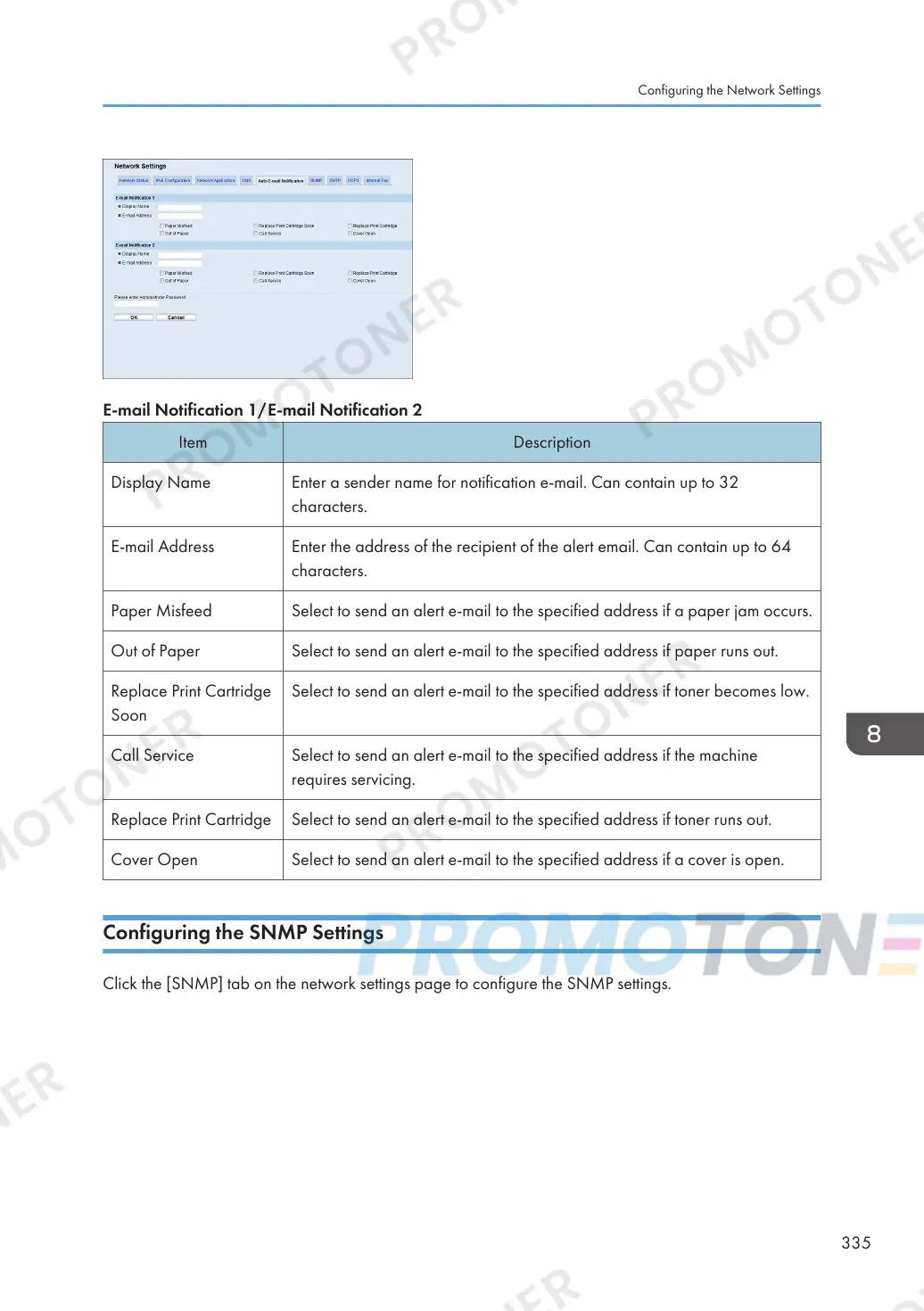 Click the [SNMP] tab on the network settings page to configure the SNMP settings.