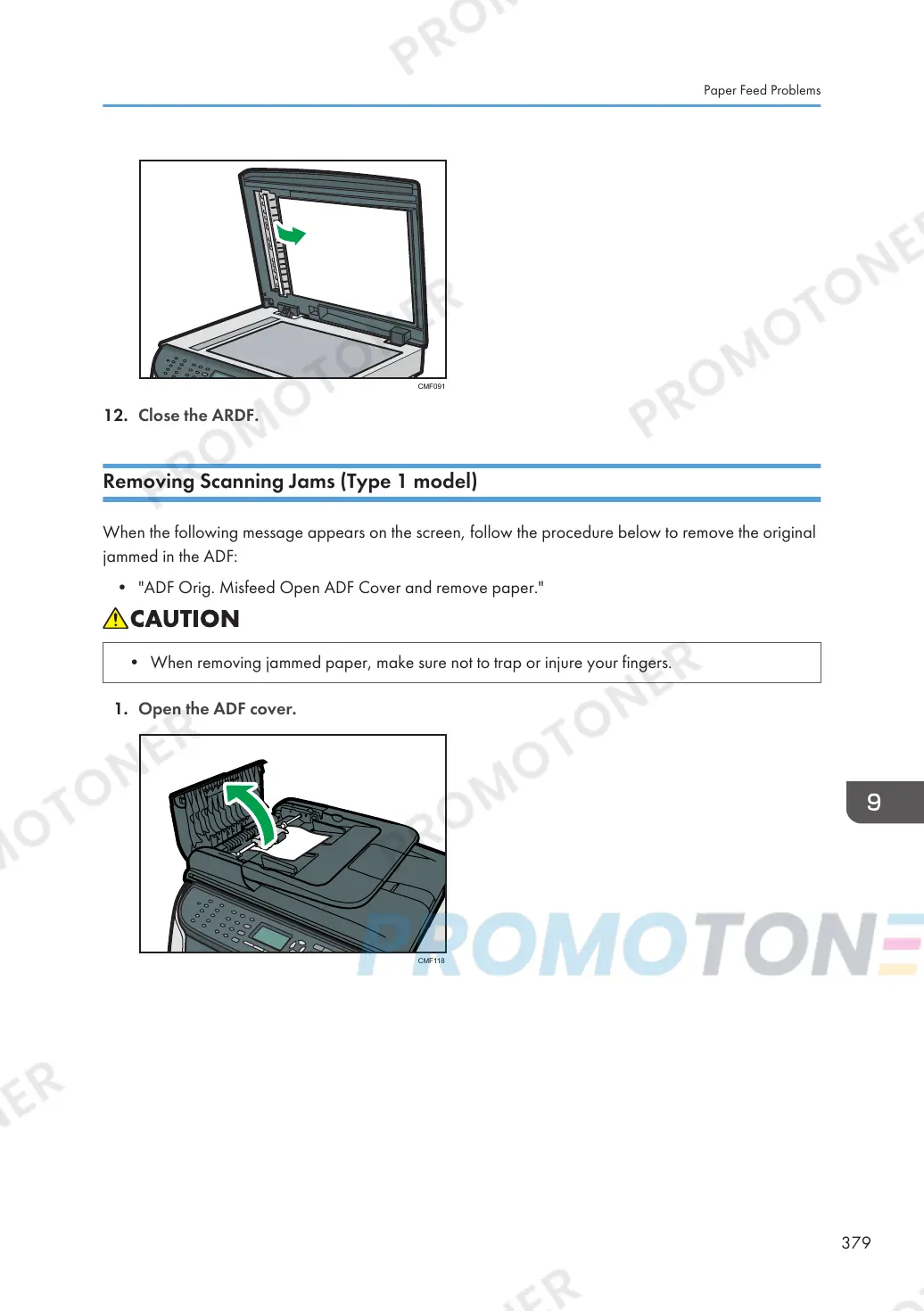 "ADF Orig. Misfeed Open ADF Cover and remove paper."