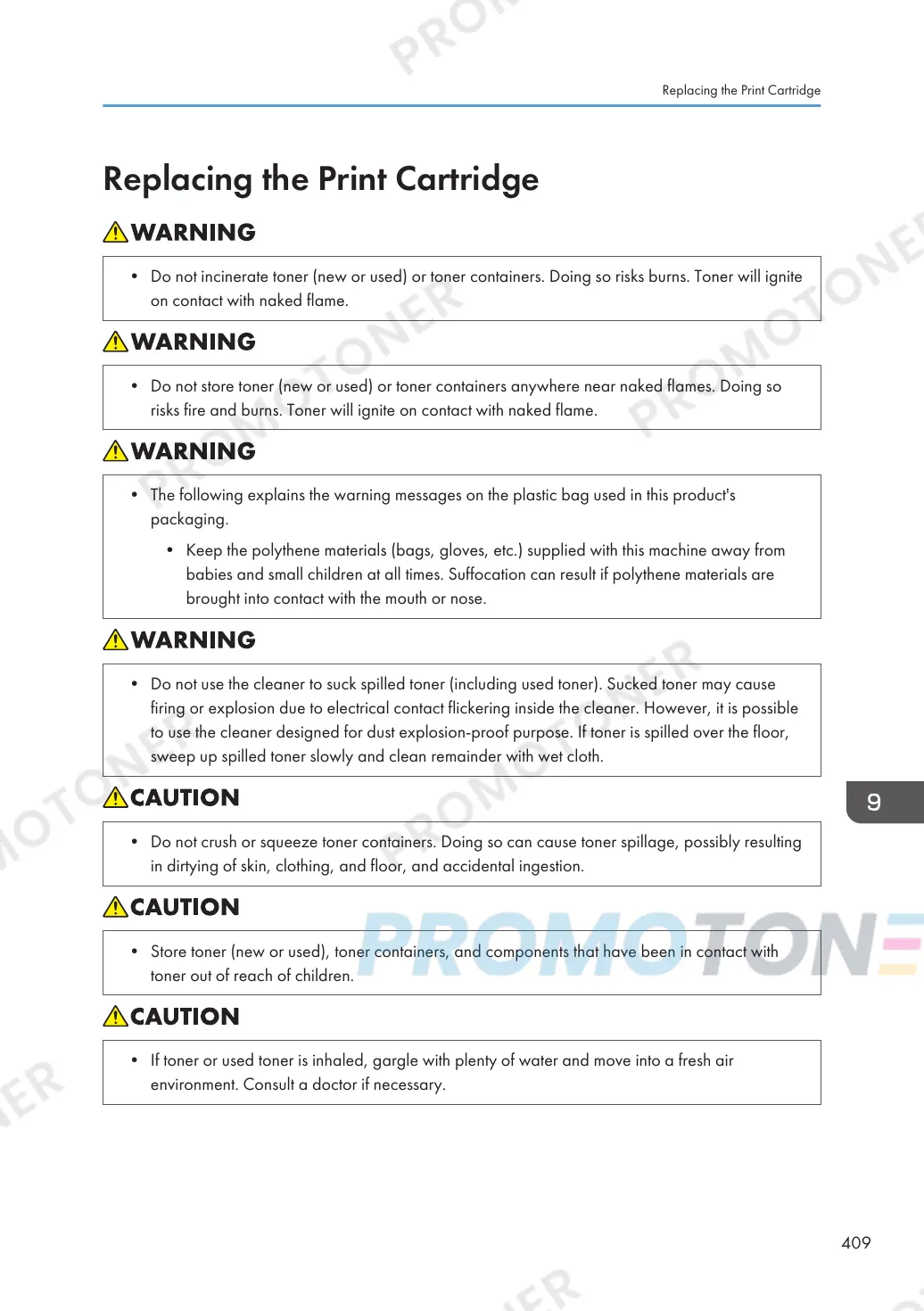 • If toner or used toner is inhaled, gargle with plenty of water and move into a fresh air