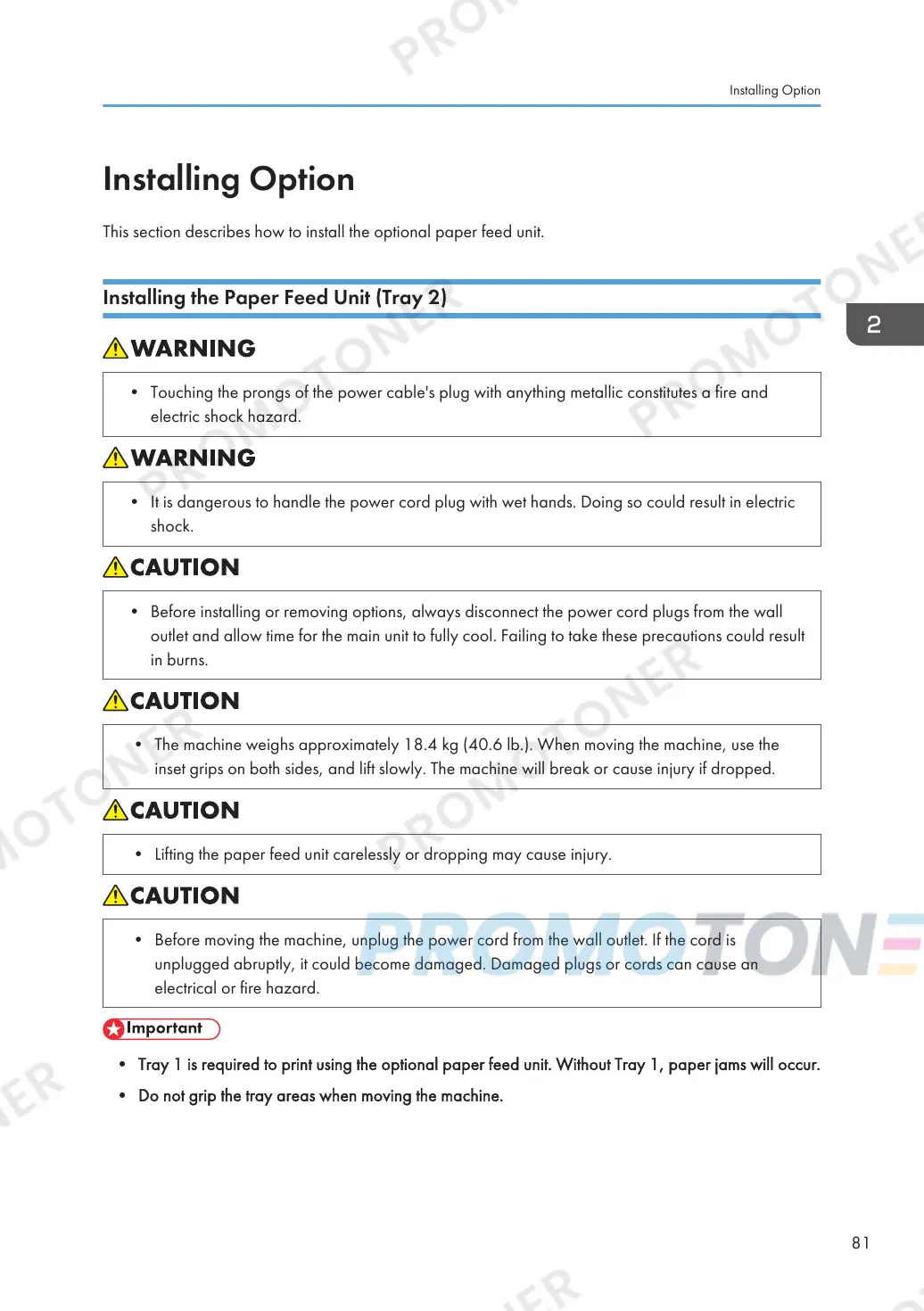• Tray 1 is required to print using the optional paper feed unit. Without Tray 1, paper jams will occur.
