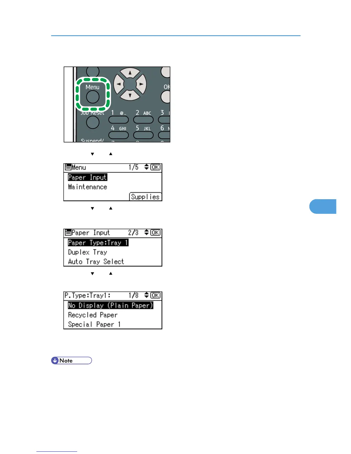 3. Press the [ ] or [ ] key to select [Paper Type: (tray name)], and then press the [OK] key.