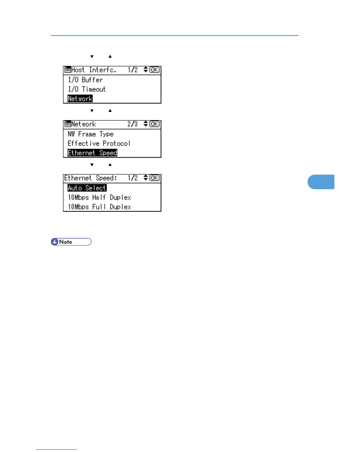 5. Press the [ ] or [ ] key to select the Ethernet speed, and then press the [OK] key.