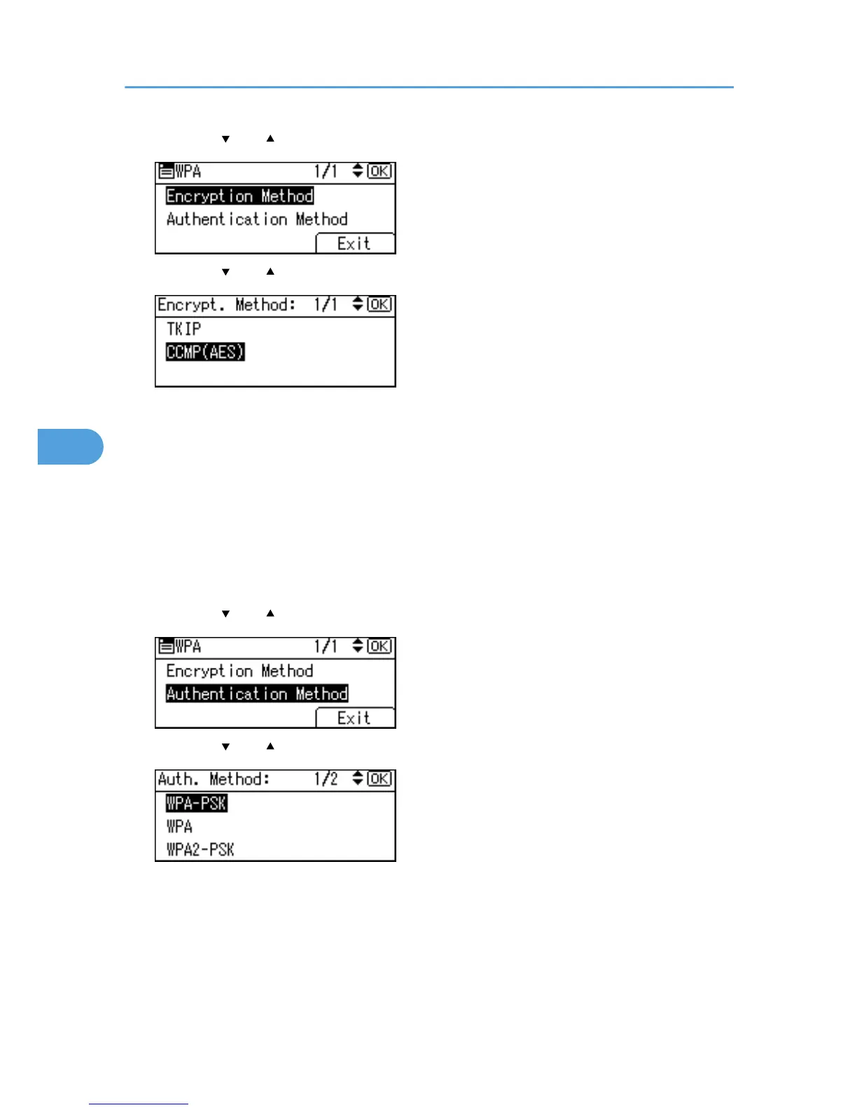 7. Press the [ ] or [ ] key to select encryption method, and then press the [OK] key.