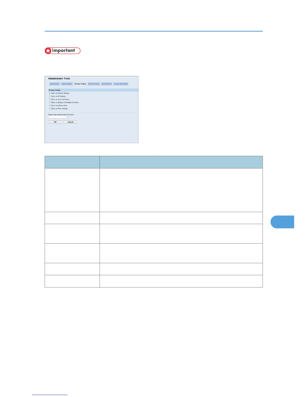 Back up Address Book Backs up fax destinations and Special Sender list to a file.
