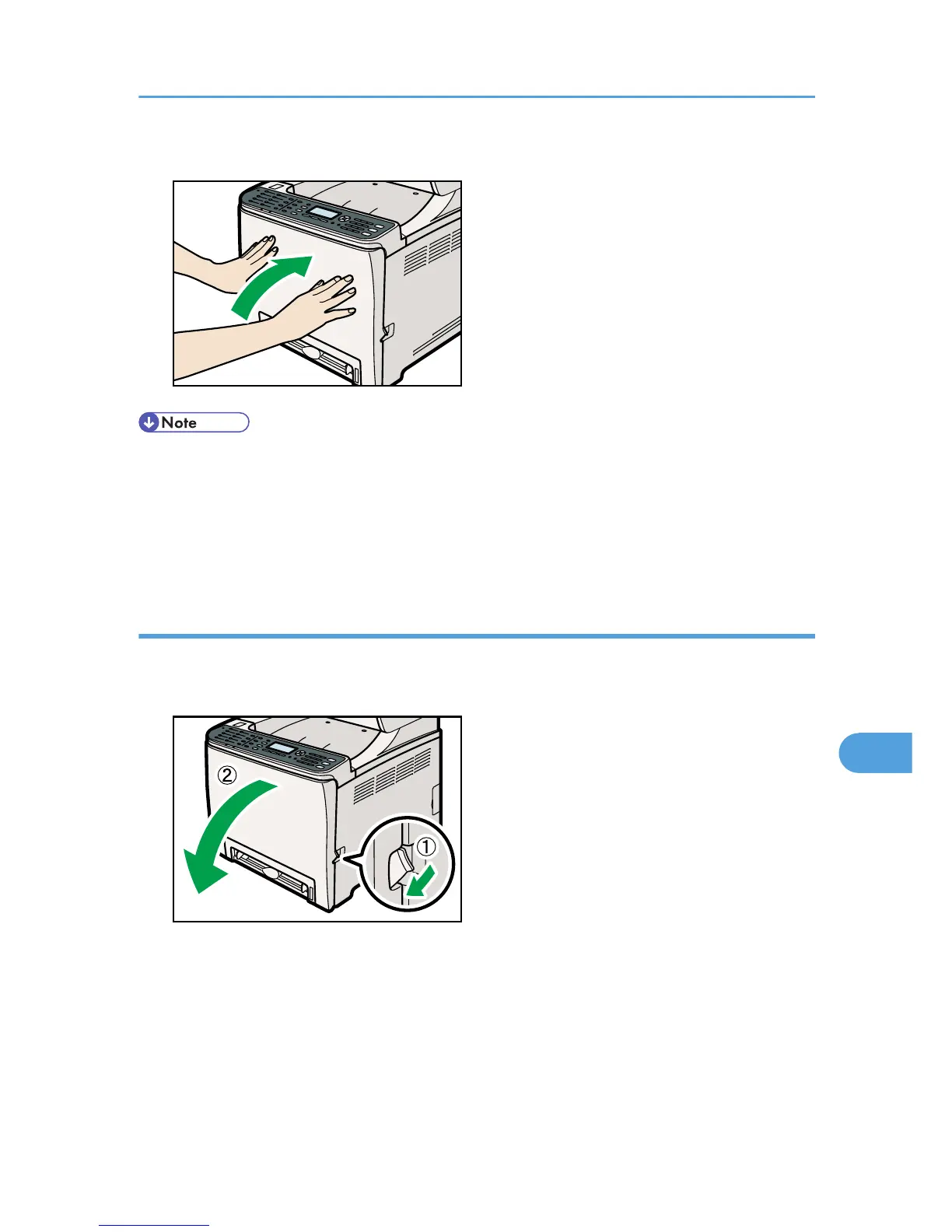 • When closing the front cover, push the upper area of the cover firmly. After closing the cover,