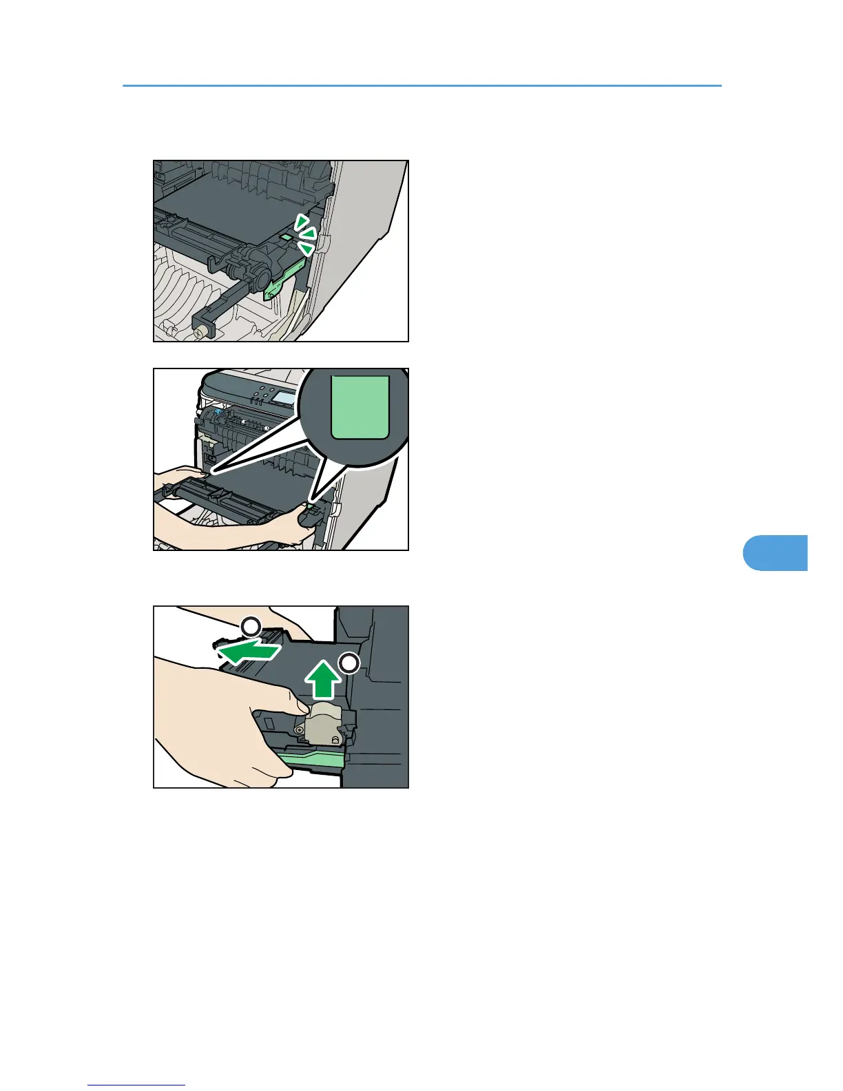 8. Hold the green parts at both ends of the intermediate transfer unit.