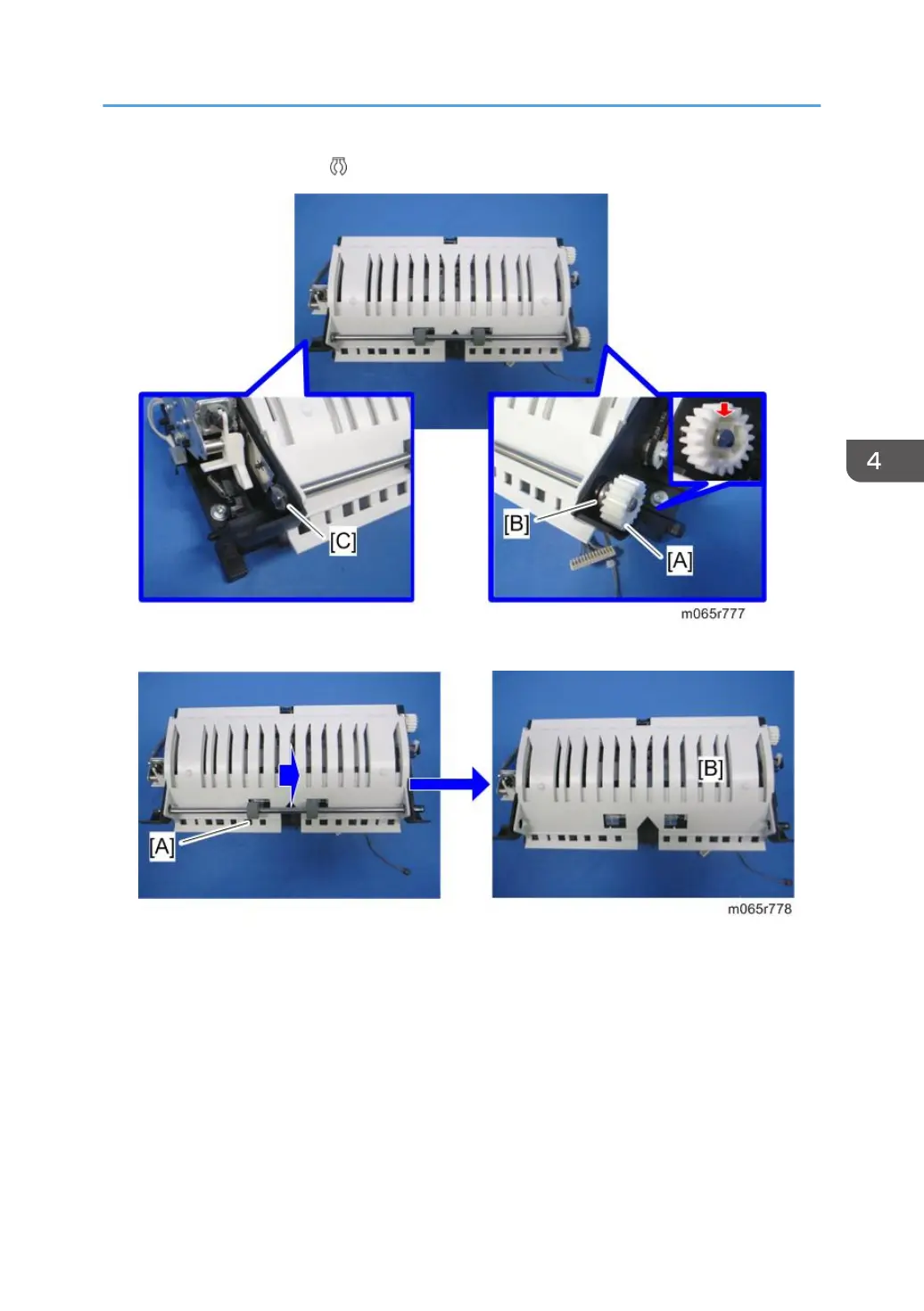 4. Remove the shaft [A], and then remove the paper exit upper guide [B].