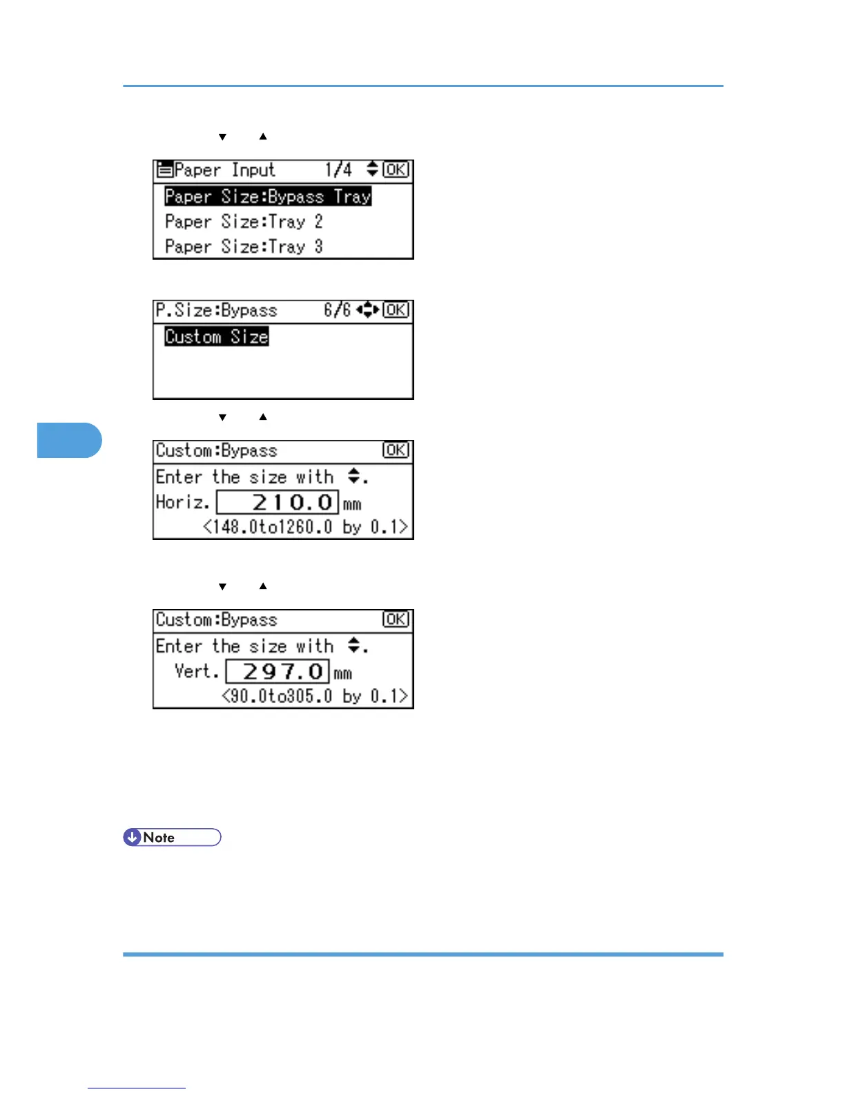 3. Press the [ ] or [ ] key to select [Paper Size: Bypass Tray], and then press the [OK] key.