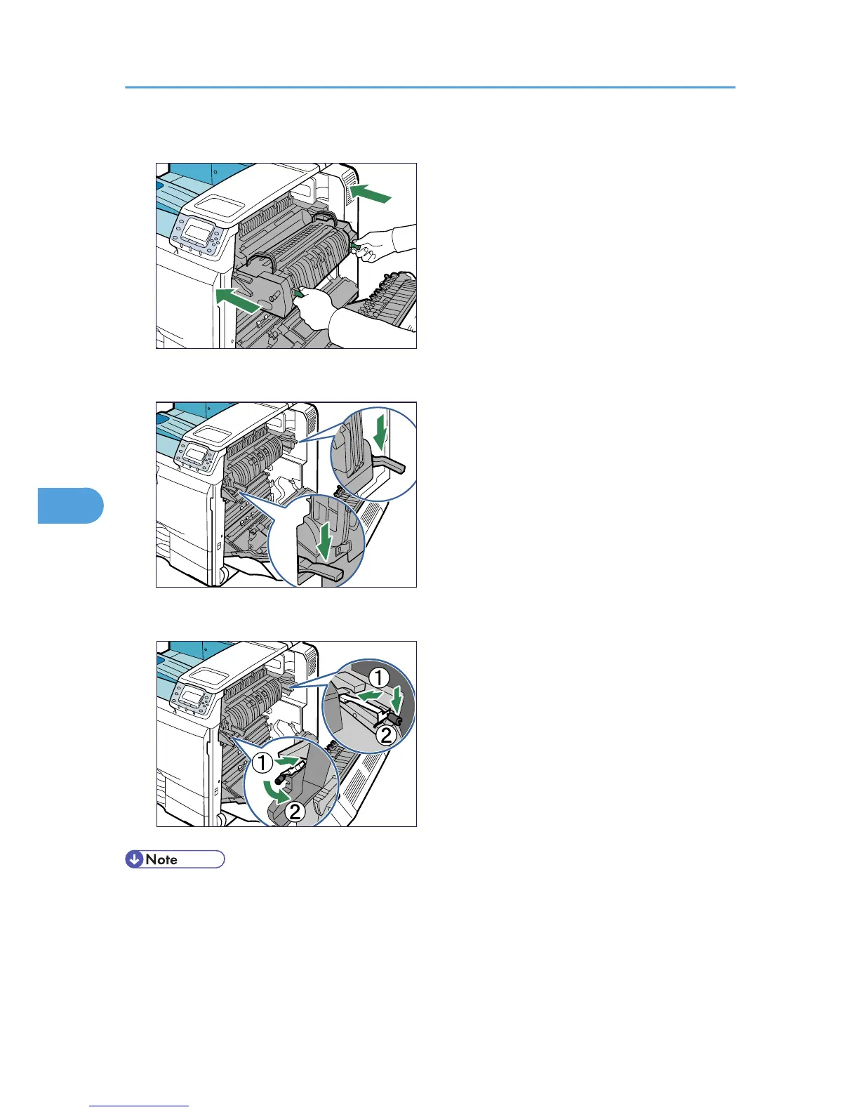 This completes fusing unit replacement. Leave the right cover open, replace the transfer roller and the