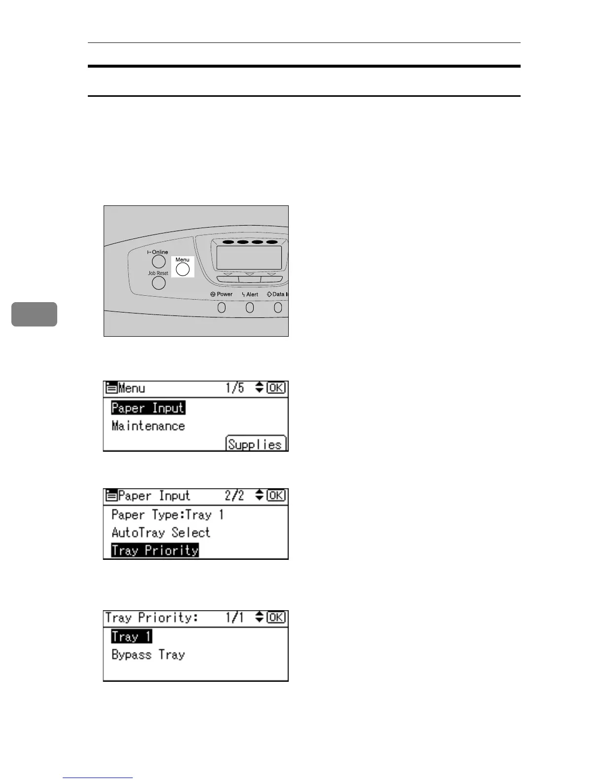 C Select [Tray Priority] using {T} or {U}, and then press the {OK} key.
