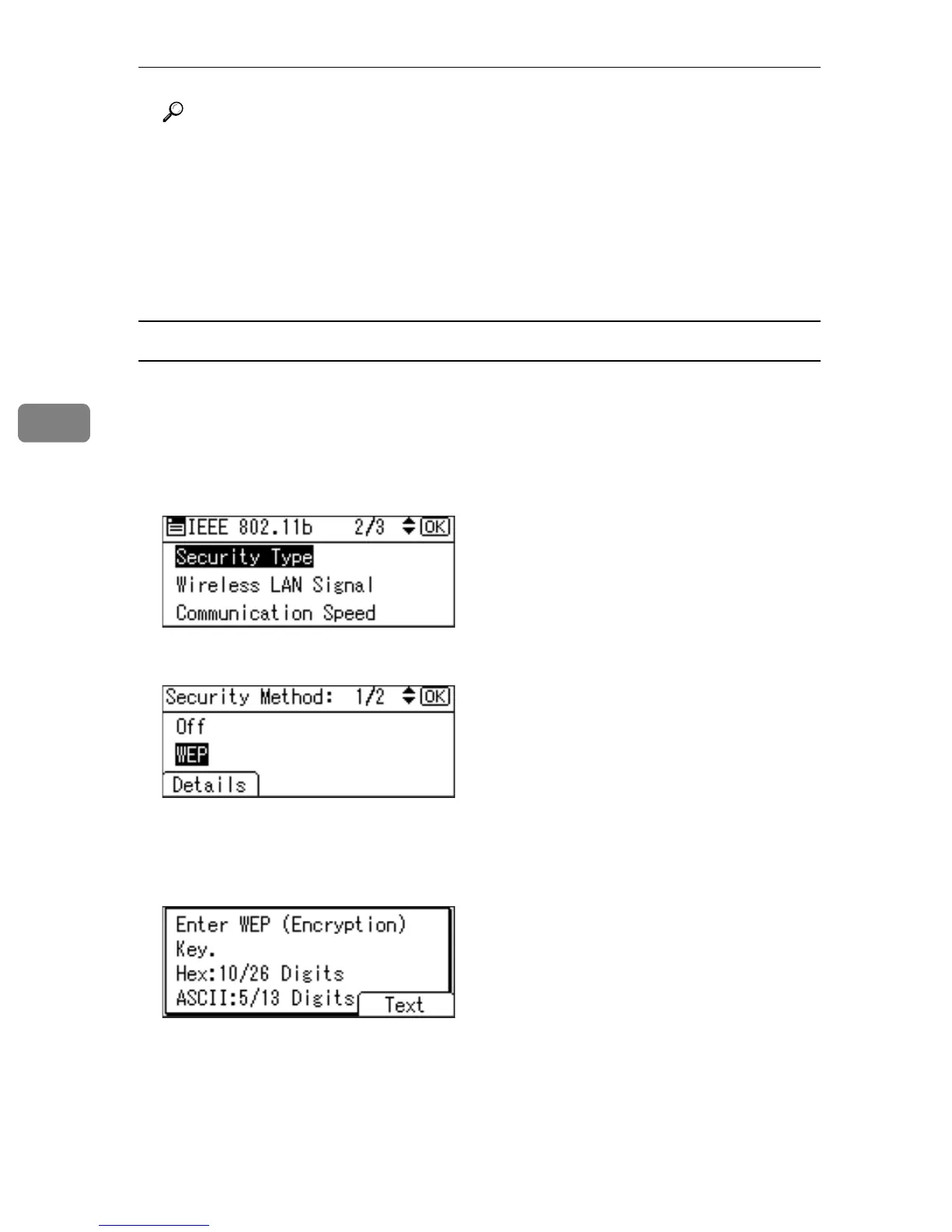 A In the [IEEE 802.11b] menu, select [Security Type] using {T} or {U}, and then