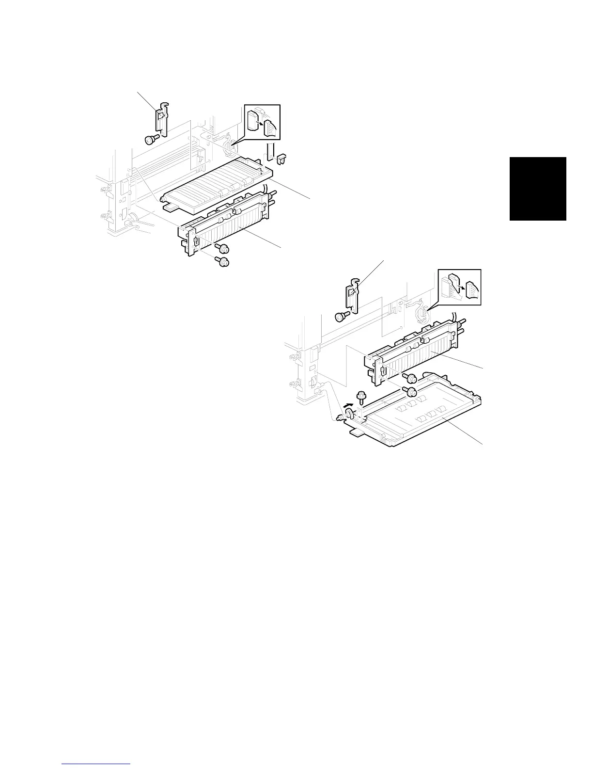 7. Remove the vertical transport cover [B] of the copier (1 snap ring).