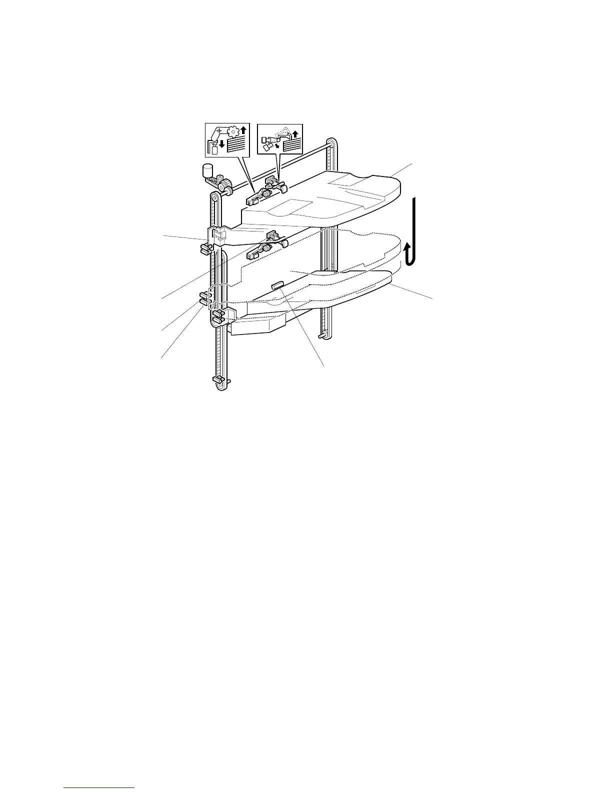 When tray 1 is moved down to the lower exit, tray 2 must be moved down out of