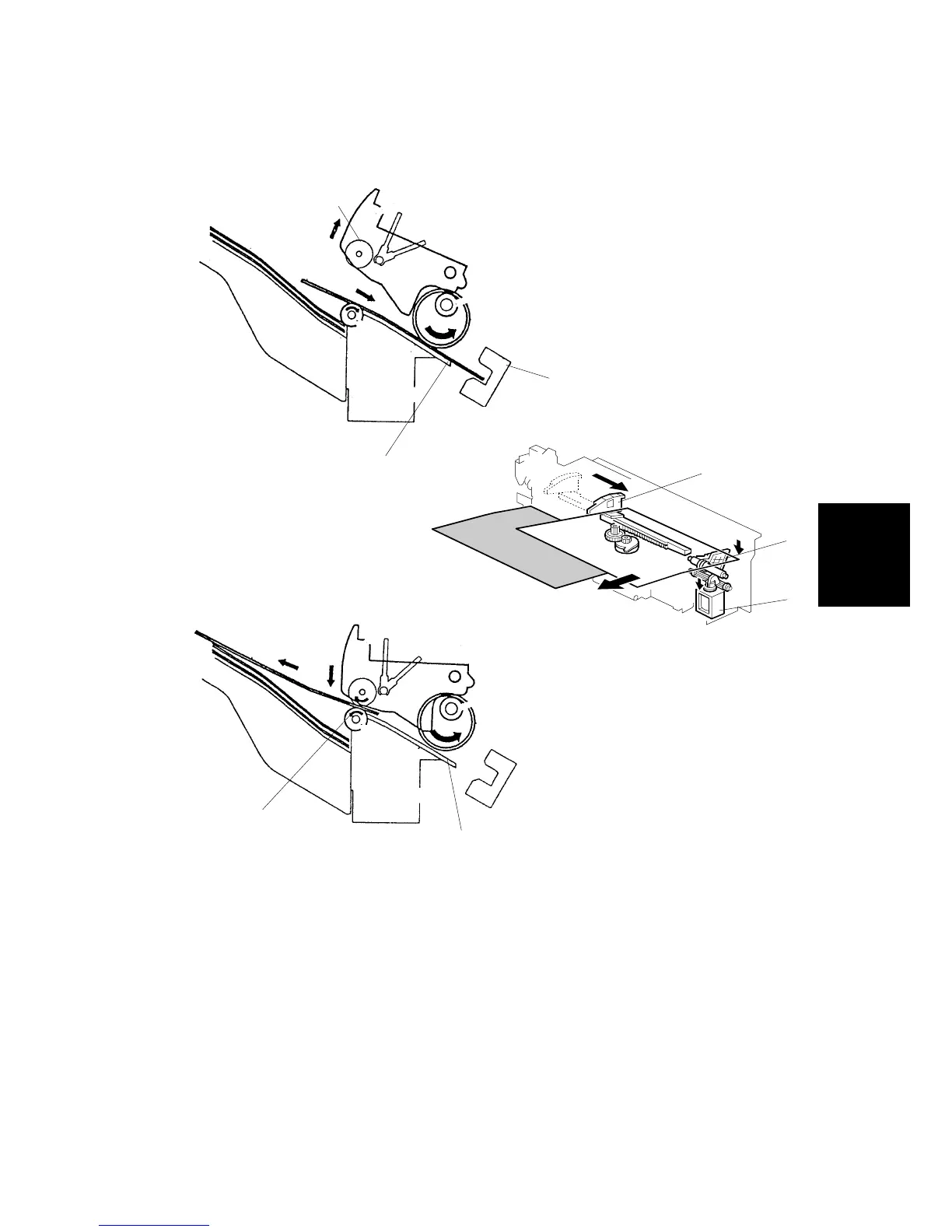 Then the front guide release solenoid [D] turns on and the front guide [E] is
