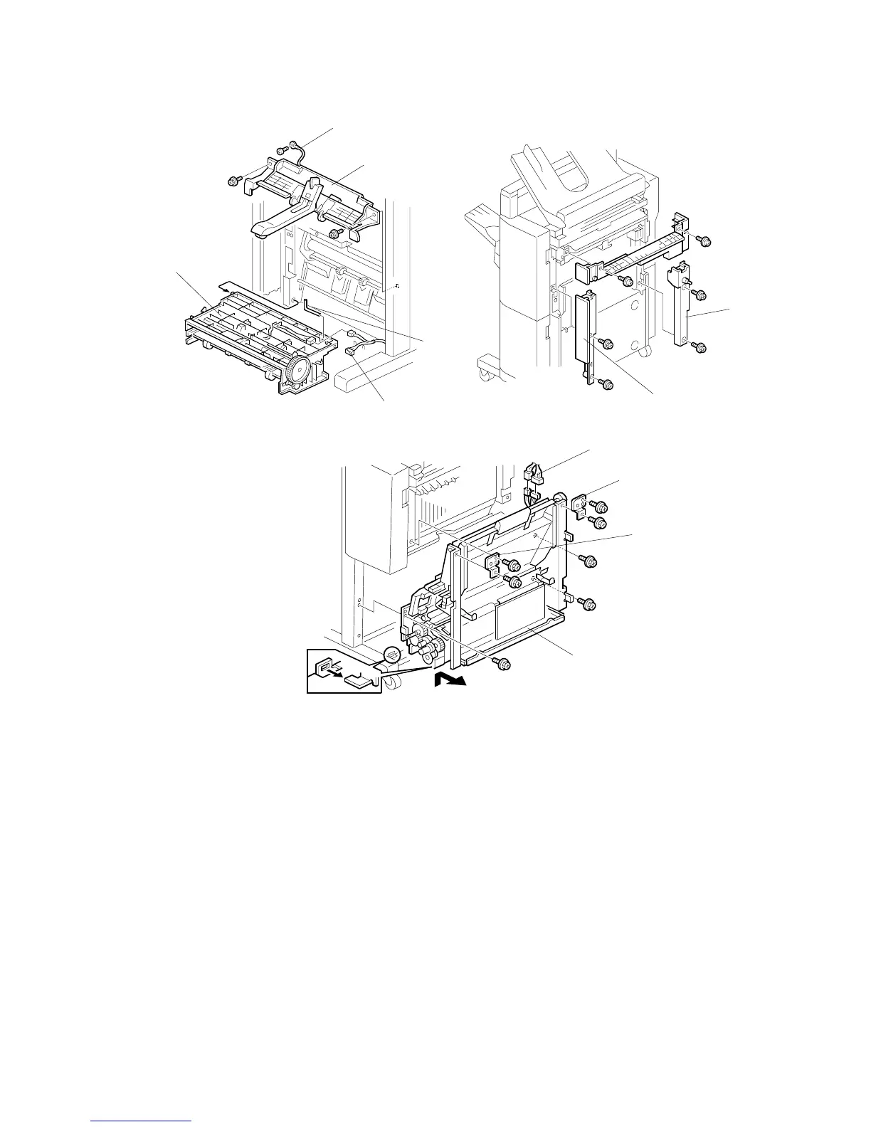 6. Open the lower booklet exit guide [C] and remove it (1 L-pin [D], x 2 [E]).