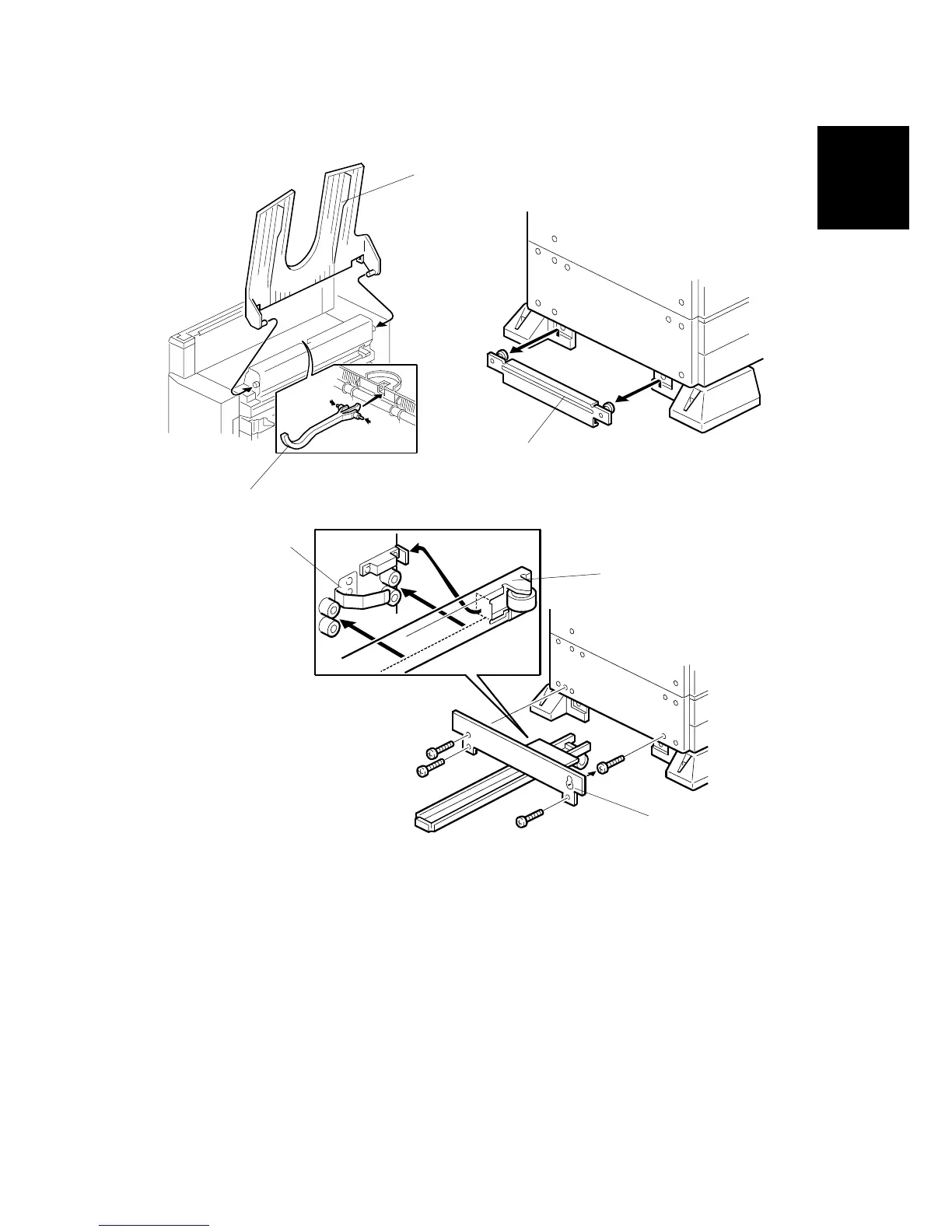 16. Install the rail bracket [F] on the left lower cover of the copier (! x 4).