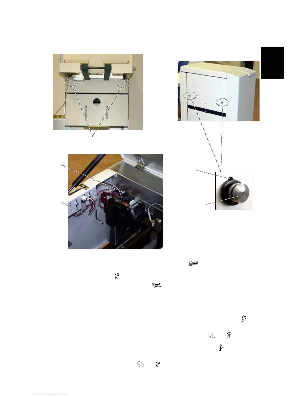 6. Remove the positioning pins from the upper holes [B], used for the belt stacker (