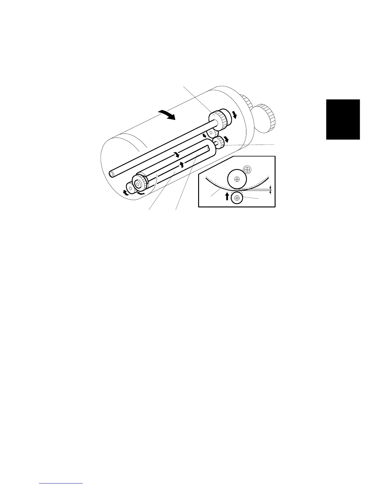 The ink roller [A] and the doctor roller [B] are driven by the gear [C] on the drum