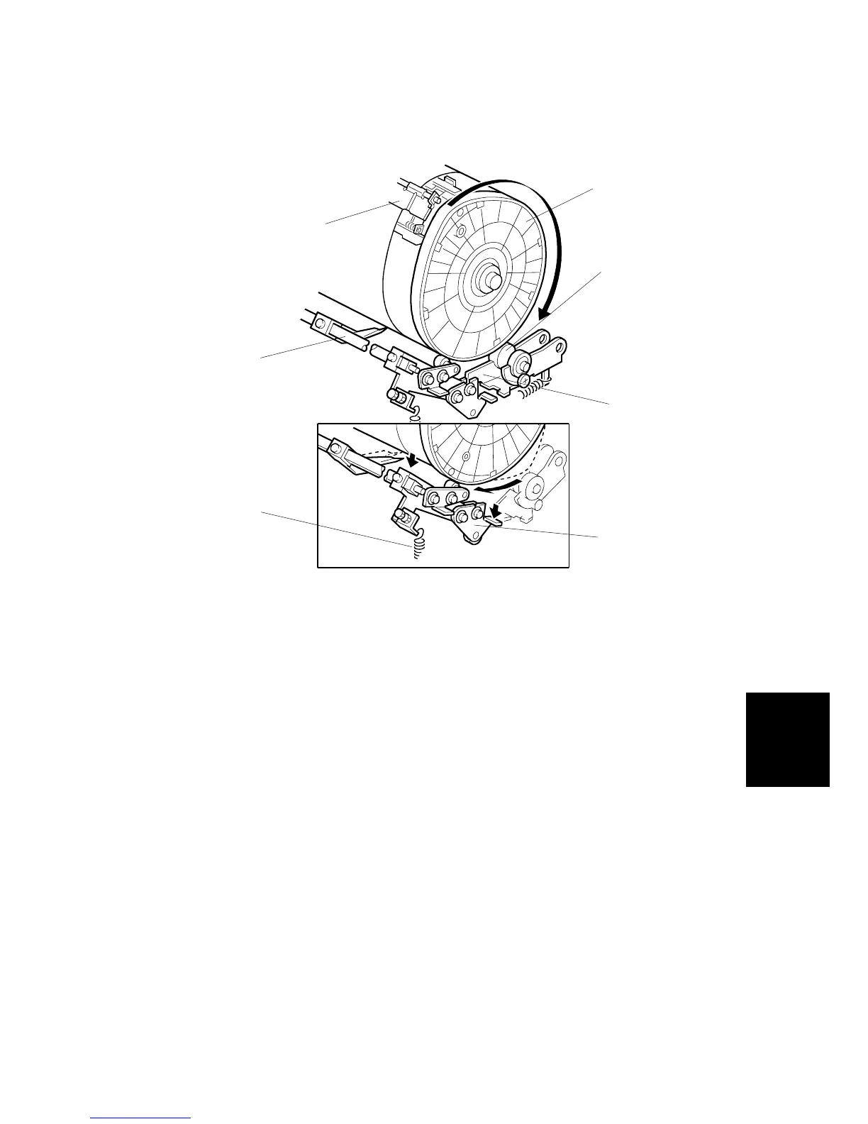 closely approaches the drum surface, due to the tension from a spring [G].
