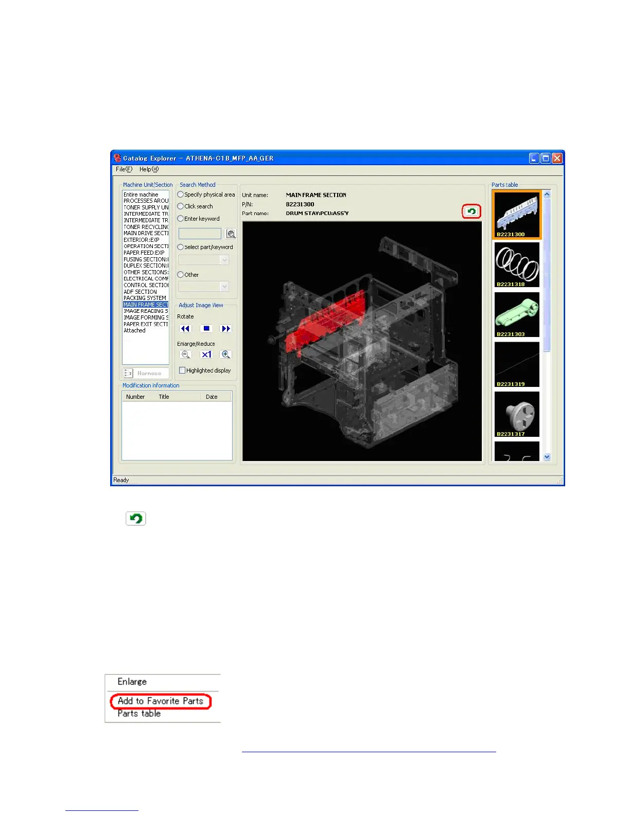 Note: When this is done, an image of the selected part will be displayed in the main image