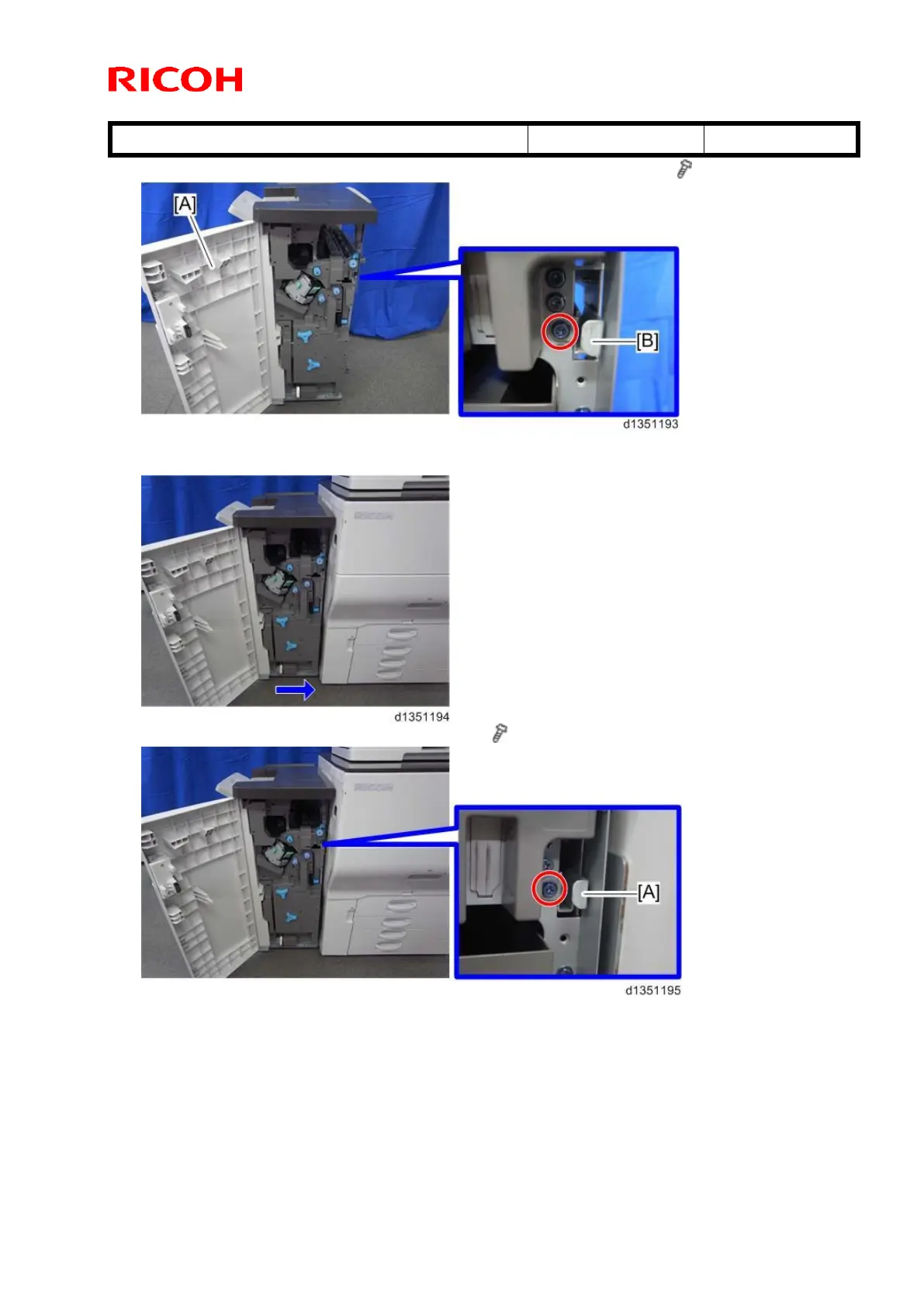 13. Open the front door [A] of the finisher, and pull the lock lever [B]. ( x 1)