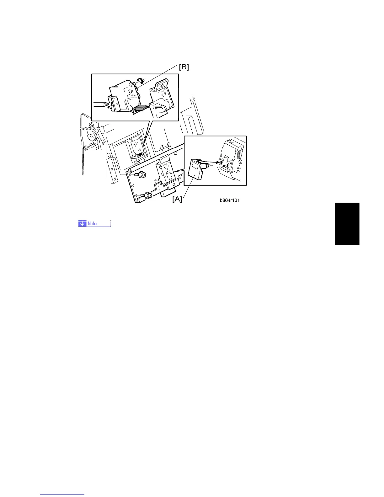 2. Attach the special tool [A] and reattach the booklet stapler stay.