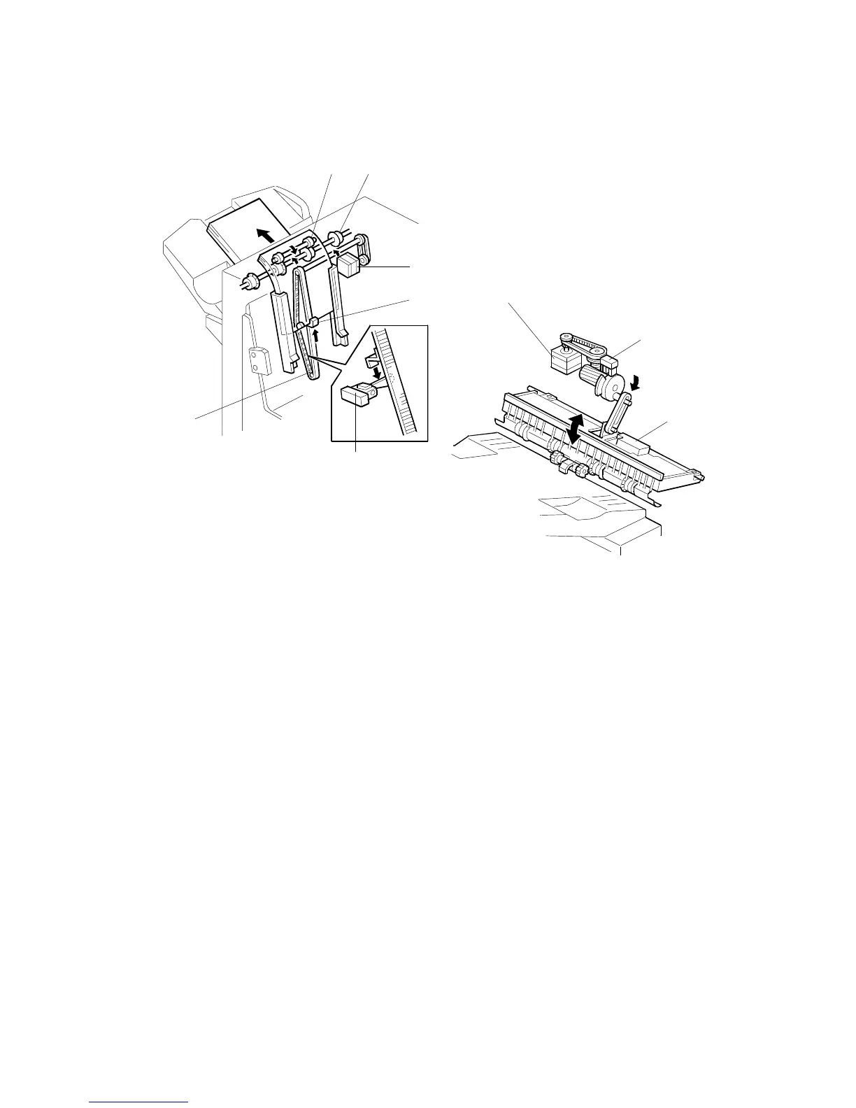 The pawl [B] on the stack feed-out belt [C] transports the set of stapled copies up