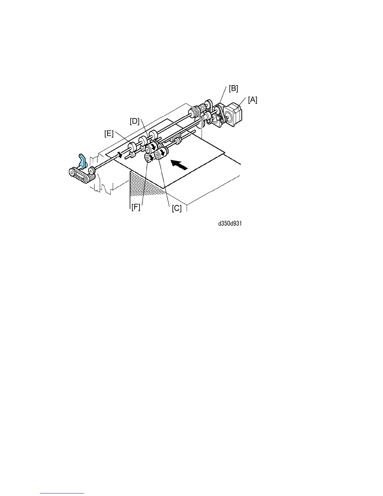The paper feed motor [A] drives the pick-up roller [C] and the paper feed roller [D].