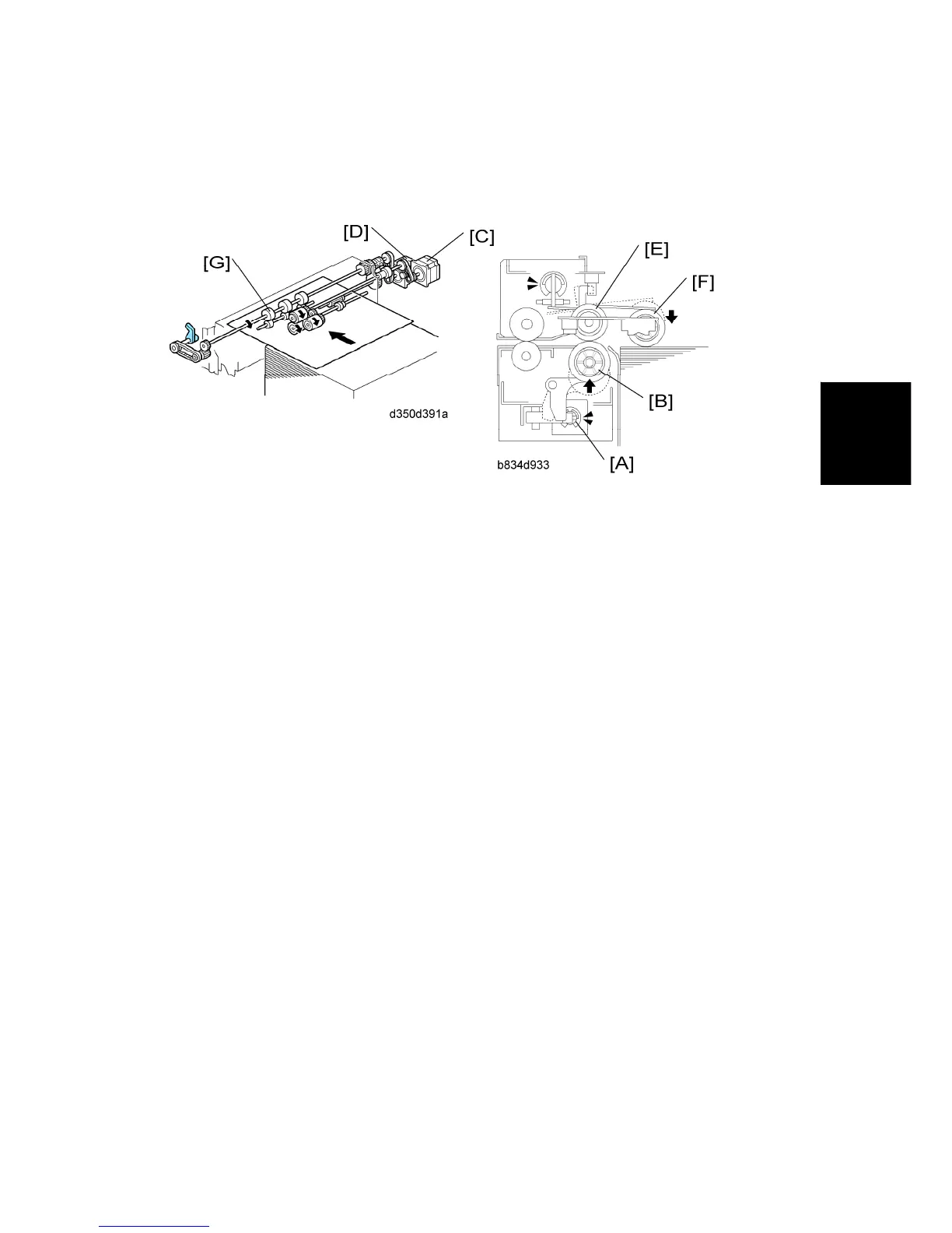 When the paper feed station is selected for a job, the paper feed motor [C] and grip motor
