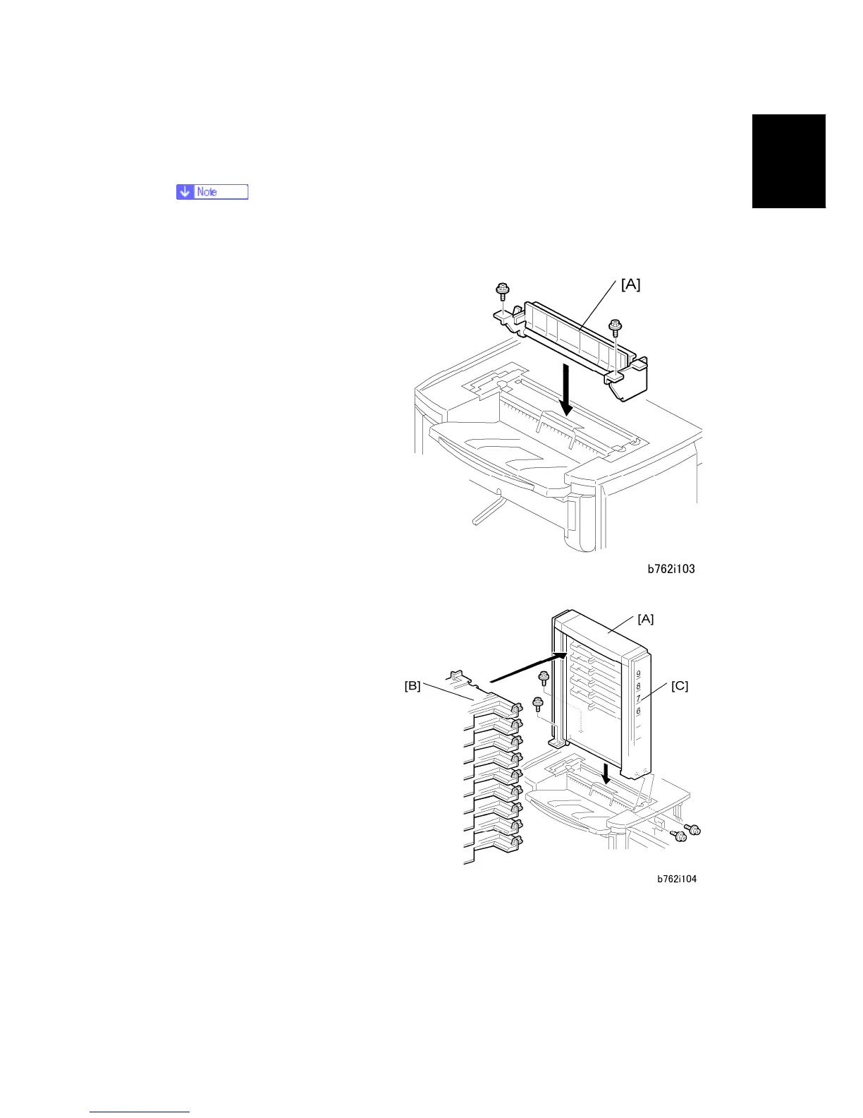 6. Attach the mailbox [A] to the top of the finisher ( x 4, M3 x 8).