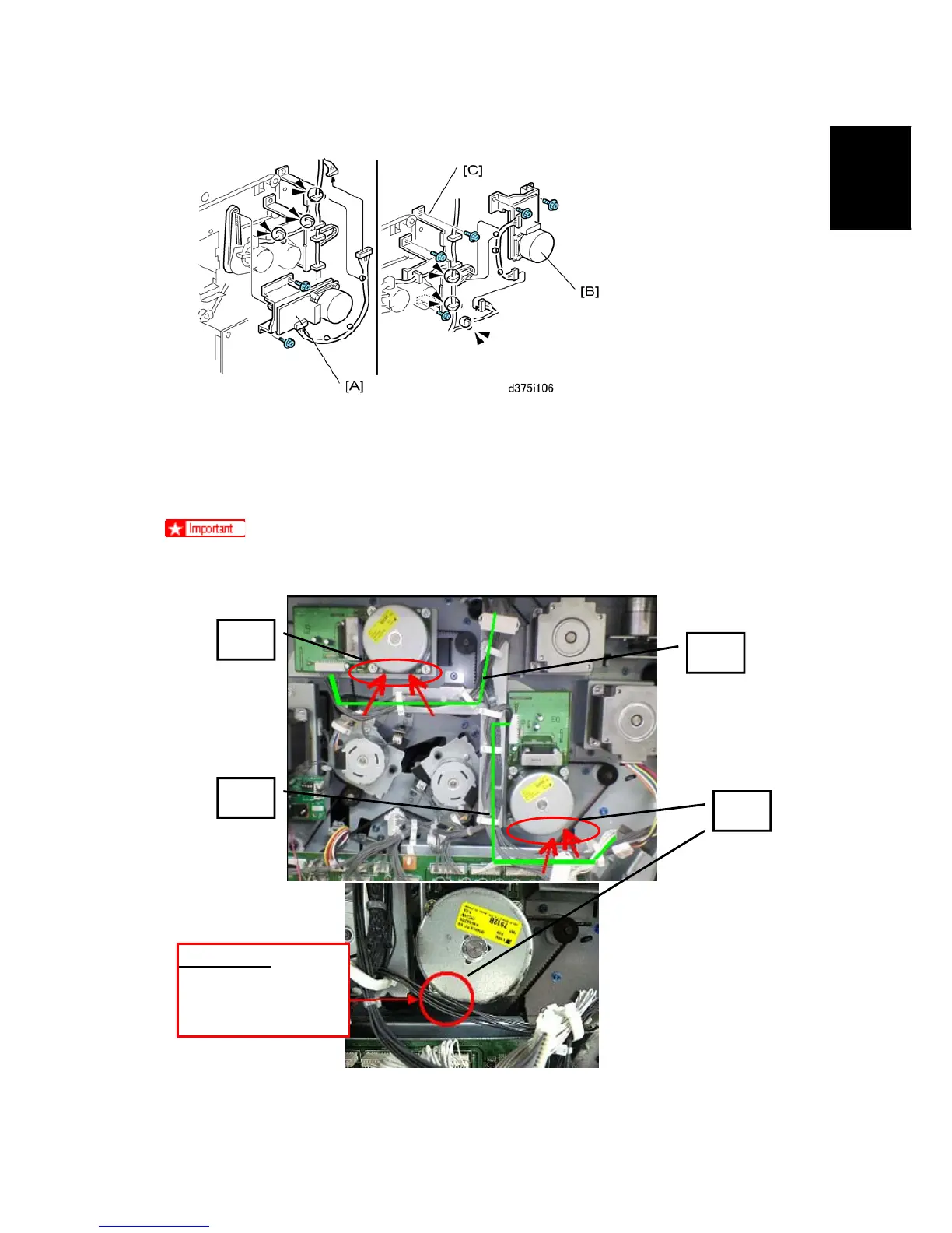harness may touch the motors ([A] and [D]), which can damage or disconnect the harness.