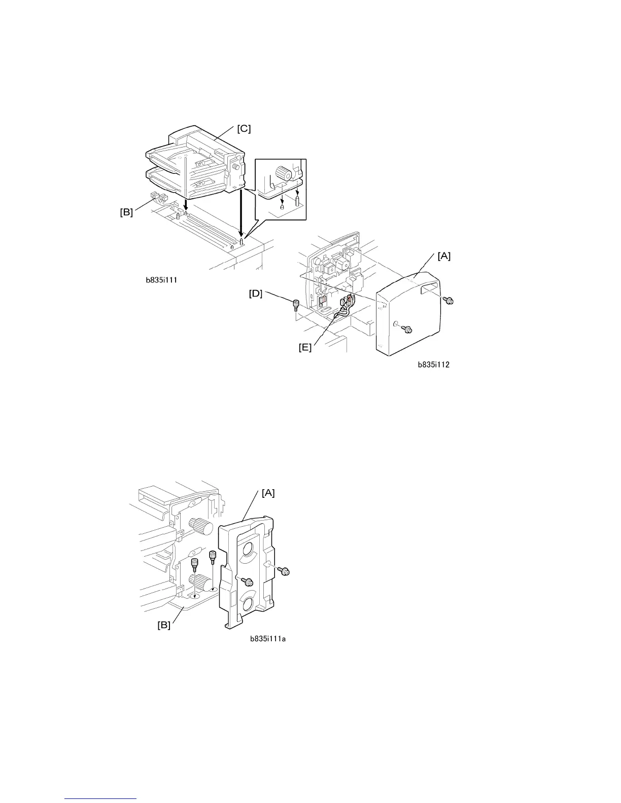 7. Remove the front inner cover [A] from the dual-tray unit ( x2).