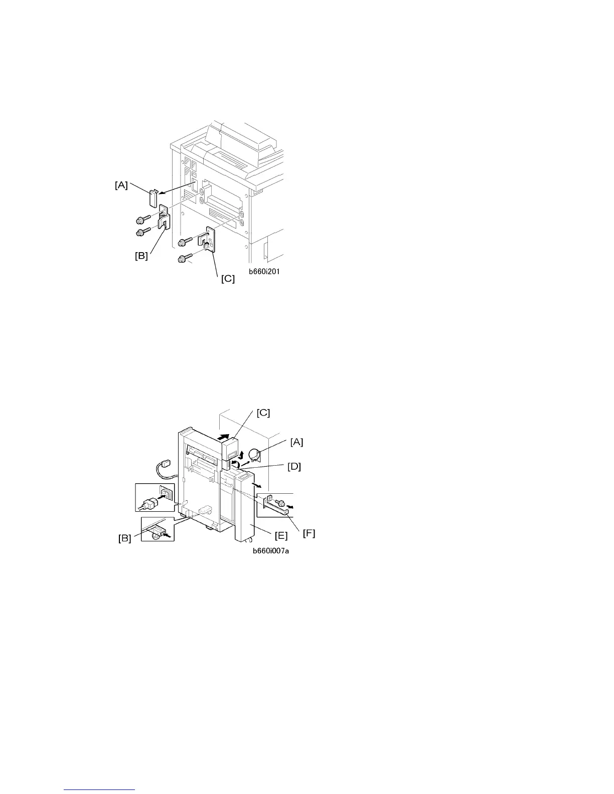 2. Remove support screw and bracket [B], push in the support, then reattach the screw