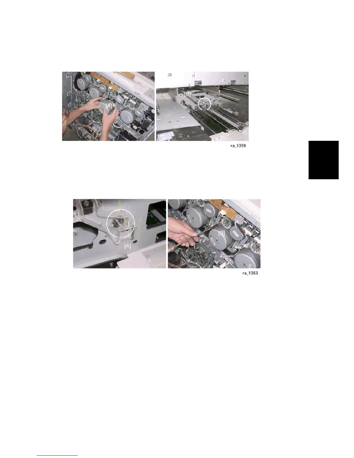 6. At the back, tighten the screws ( x3) of the drum motor [B] and attach its connector