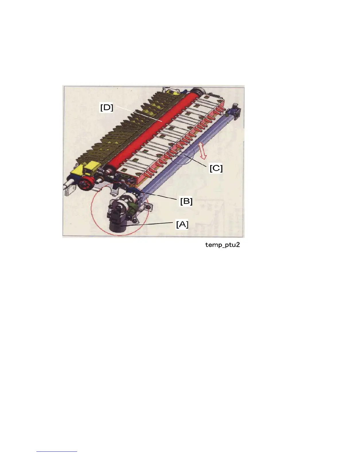 The PTR lift motor [A] rotates cam [B]. The rotation of the cam raises and lowers the lift plate