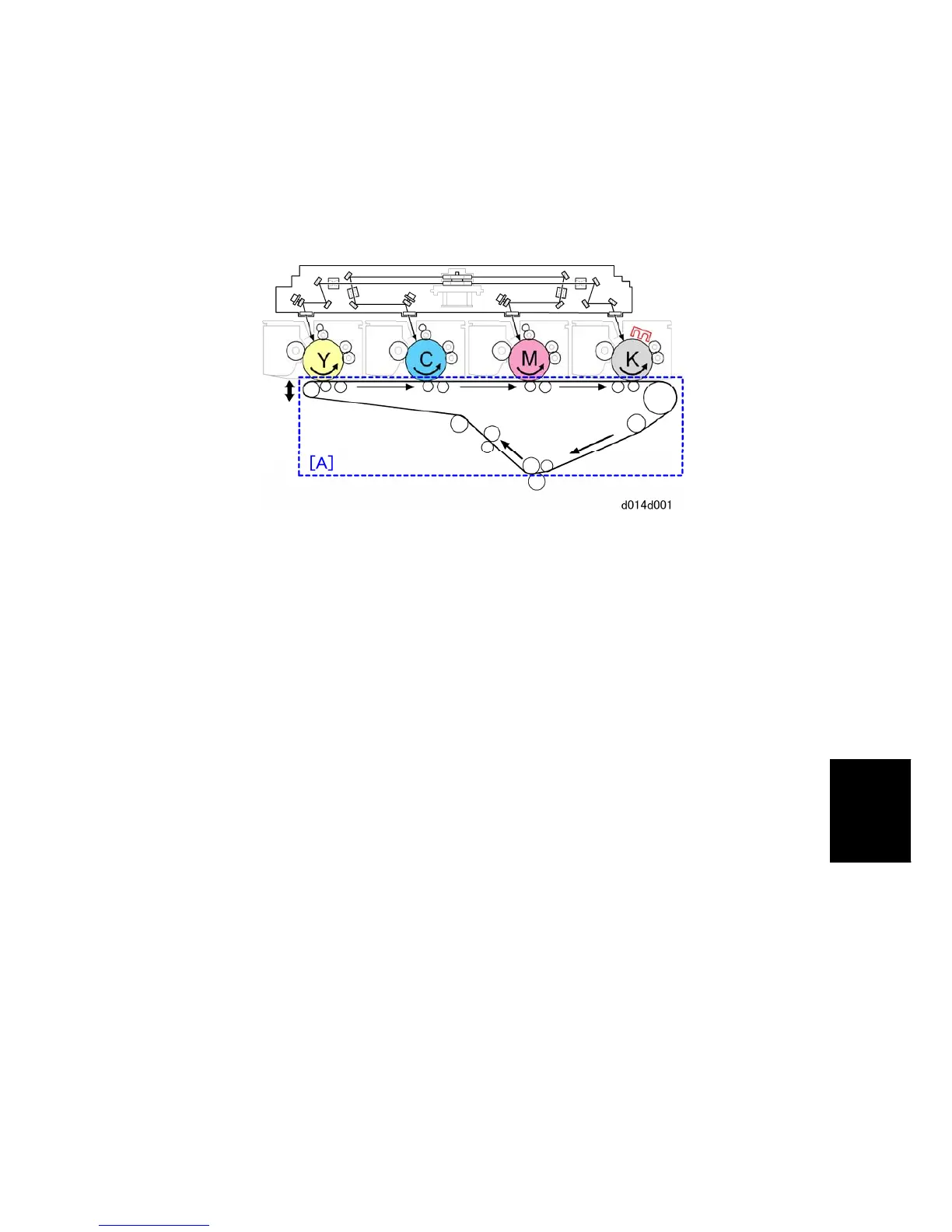 The ITB lift motor lowers the ITB for black-and-white copying. Only the black PCU (K)