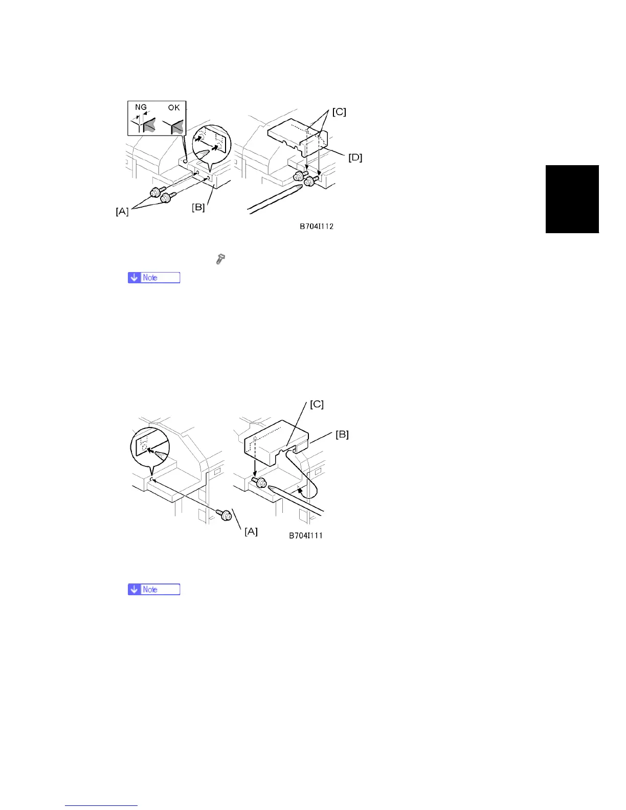 2. Align the cutouts [C] of the right rear corner plate [D] with the screws and attach the