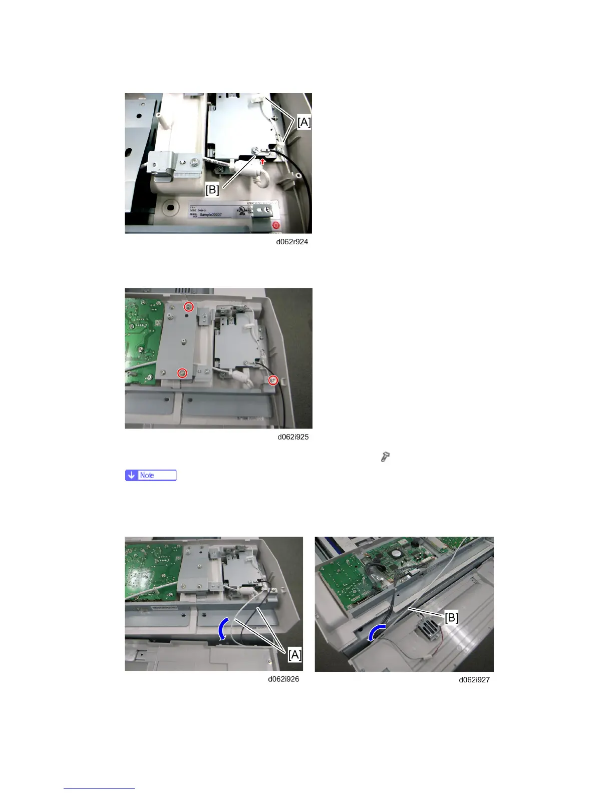10. Put the ground wires [A] and the USB Cable [B] into the machine as shown in the