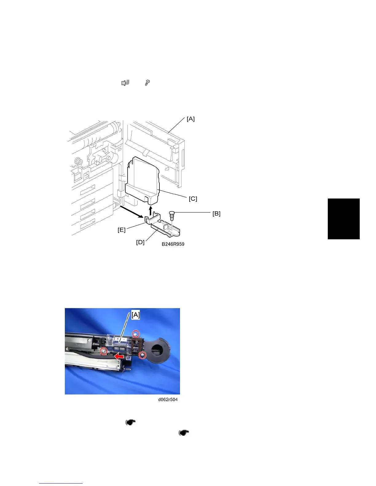 2. Remove the lock pin [B], then pull out the toner collection bottle [C] and its base [D].