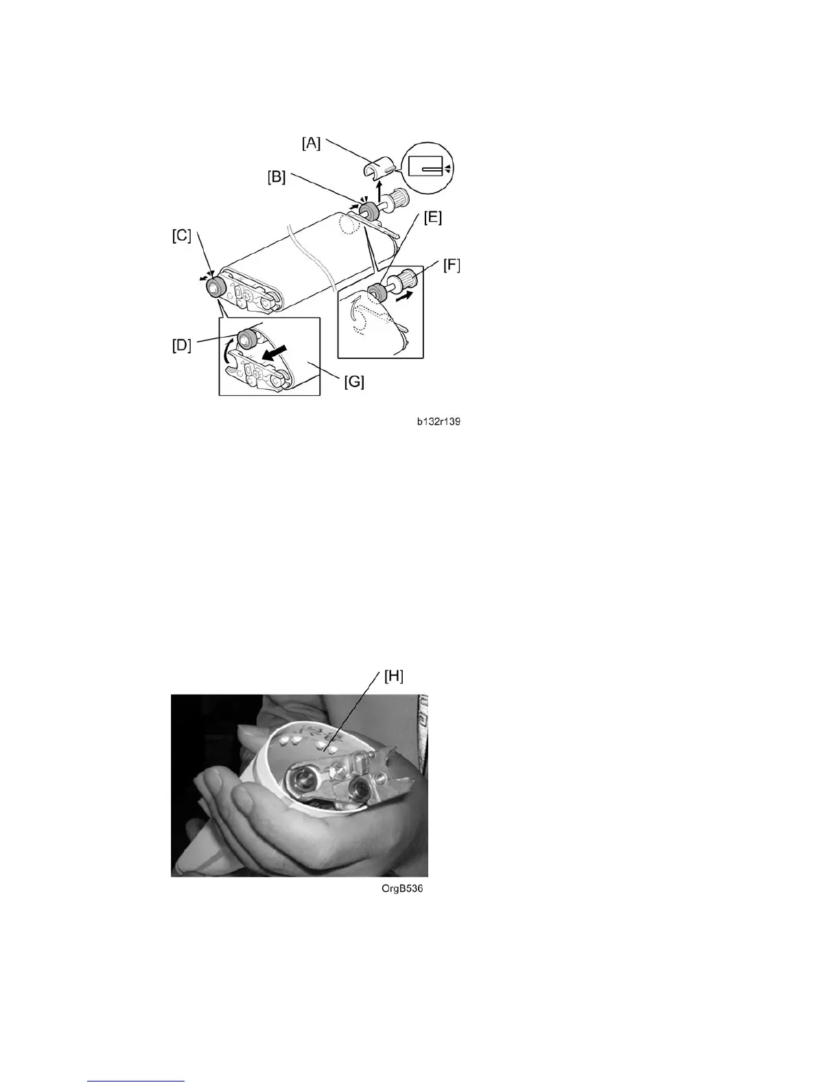 13. Pull the shaft [F] out of the belt.