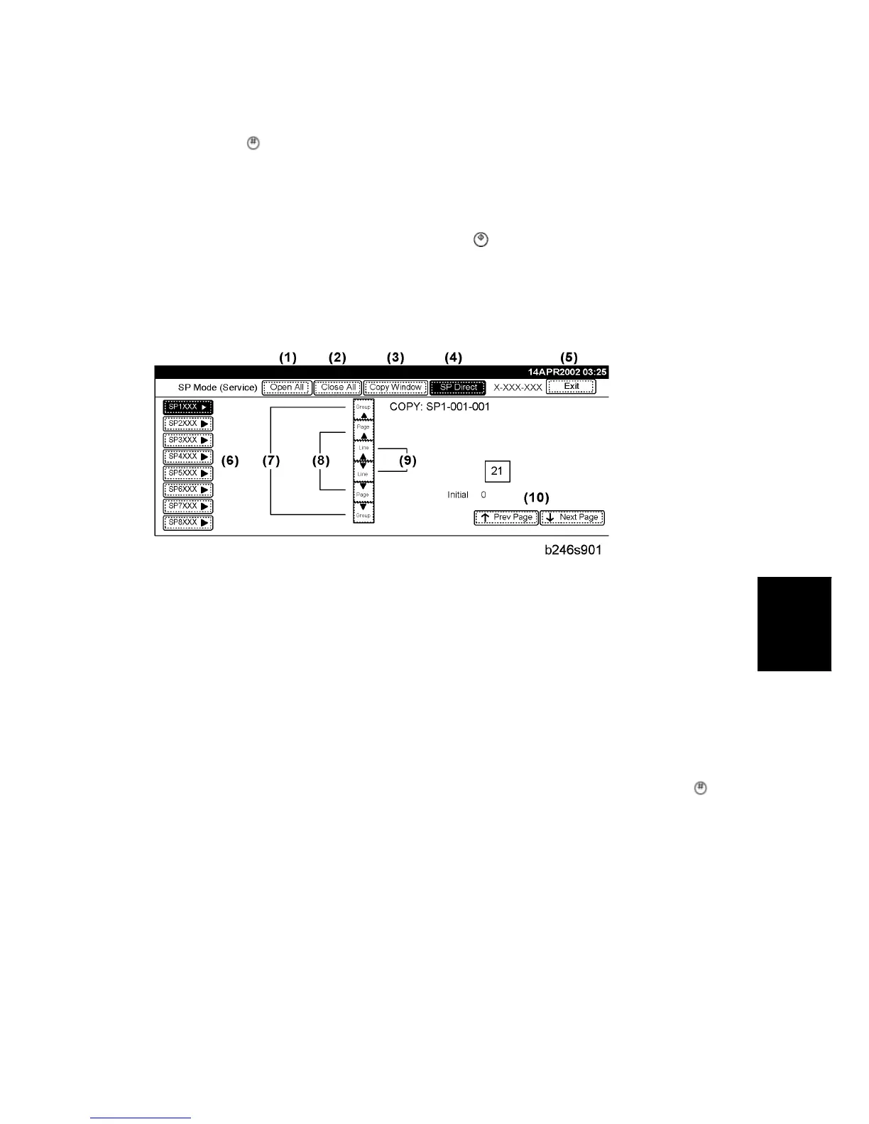 Opens the copy window (copy mode) so you can make test copies. To return to the SP