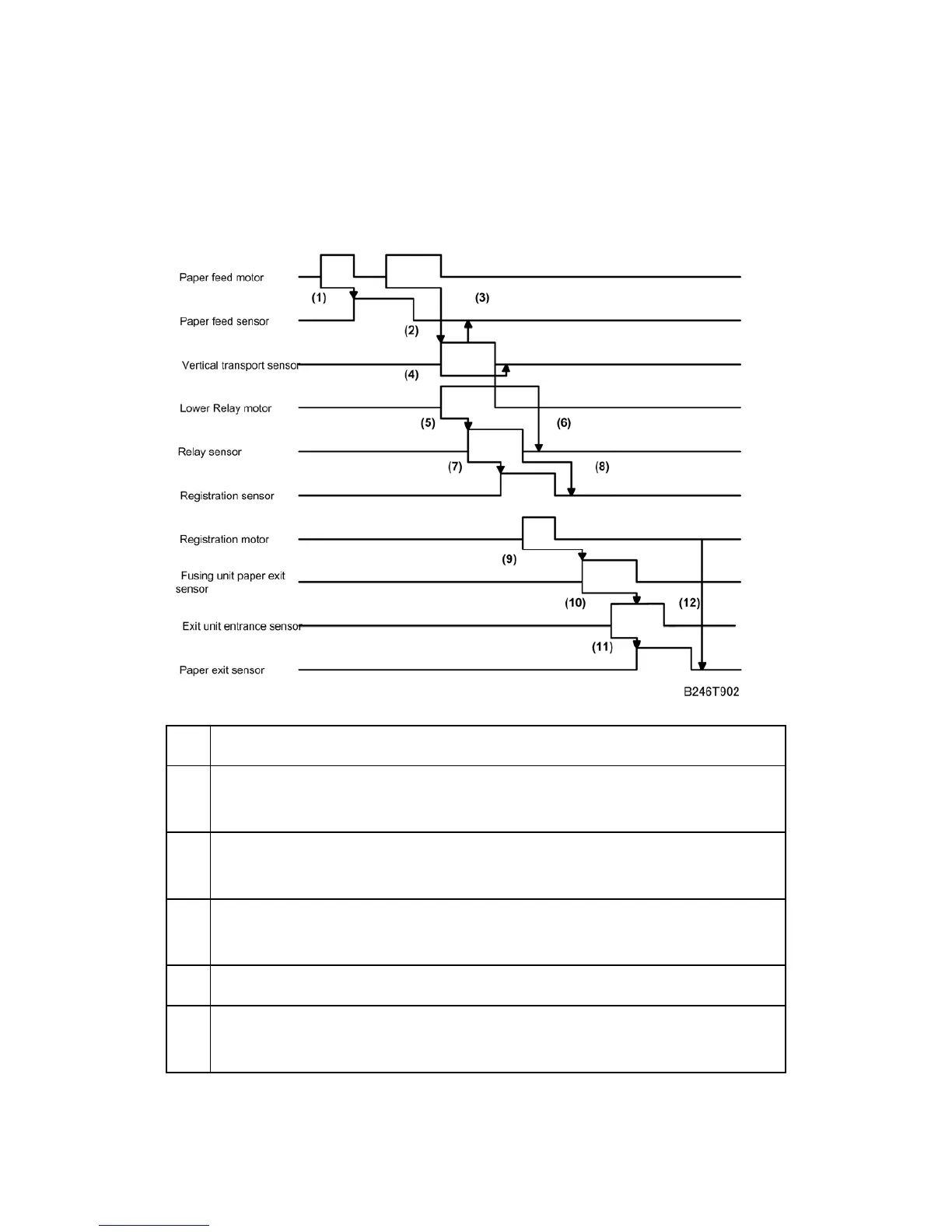 (1): Paper feed motor ON > Paper feed sensor does not switch ON at the correct time.