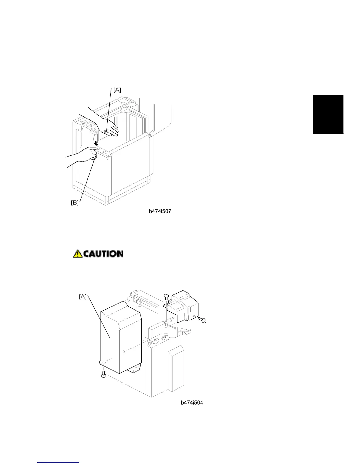 2. Lower the LCT tray. Cover the near end sensor [A], then press the tray down button [B]