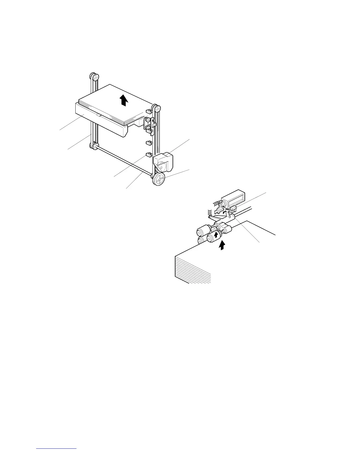 Tray motor [A] → Gear [B] → Shaft [C] → Tray belts [D] raise and lower the paper