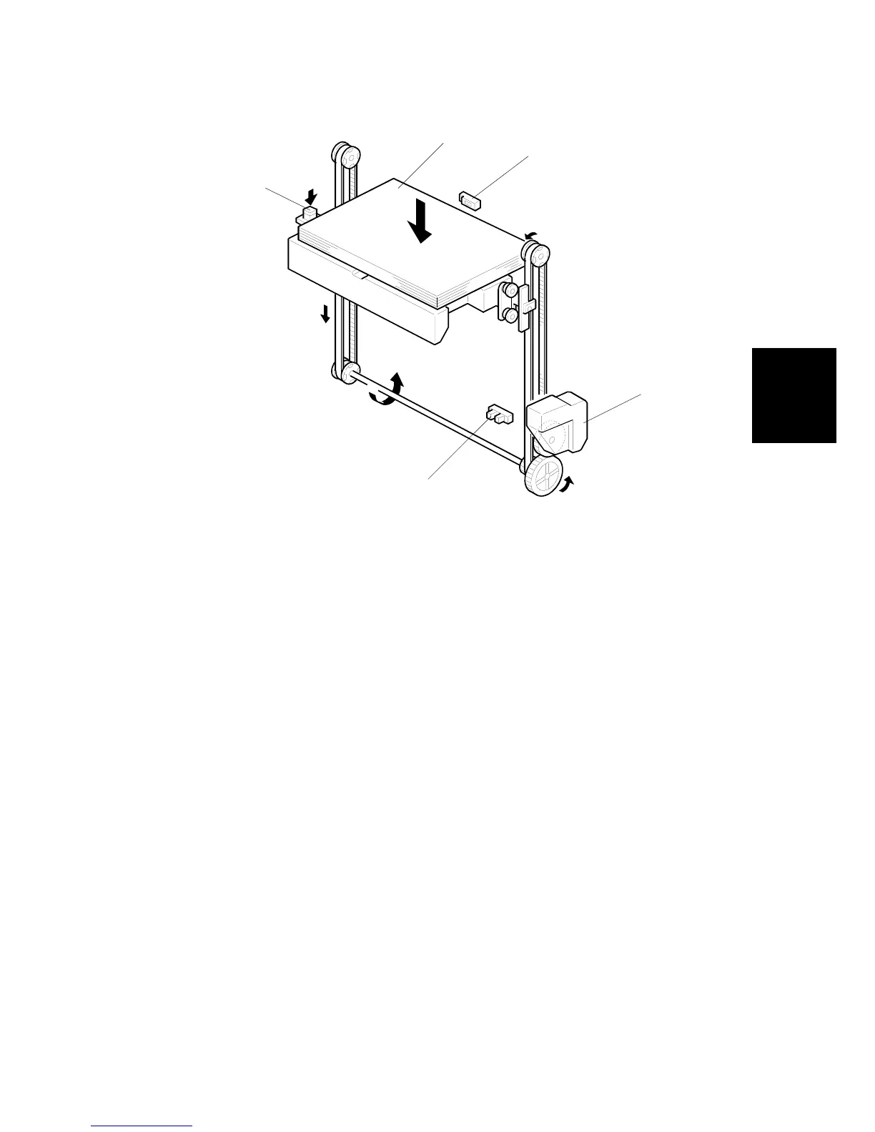 The tray lowers until the stack sensor [D] detects the top of the stack and stops the