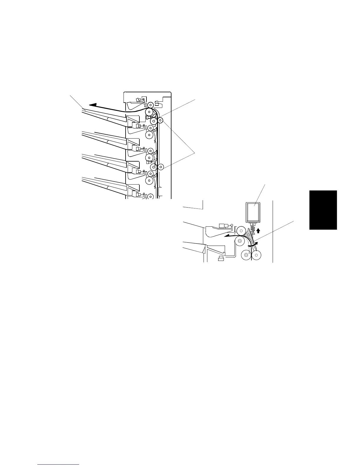 transport rollers [A] begin to turn. The exit roller [B] feeds the paper out to the