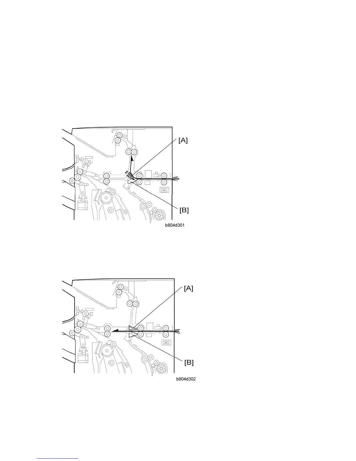 Proof tray junction gate [A] remains closed. Staple tray junction gate [B] remains closed.