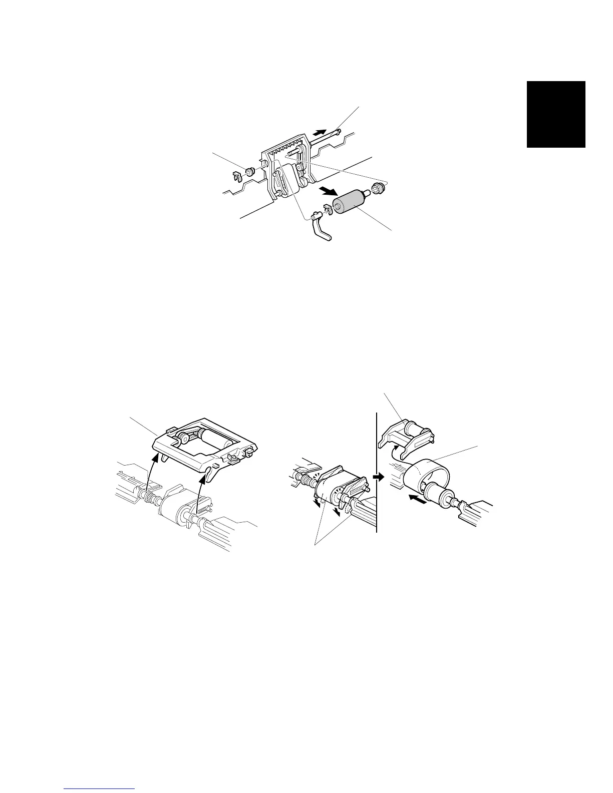 3. Pull the shaft [B] part way out at the gear end, so that the pick-up roller [C] can