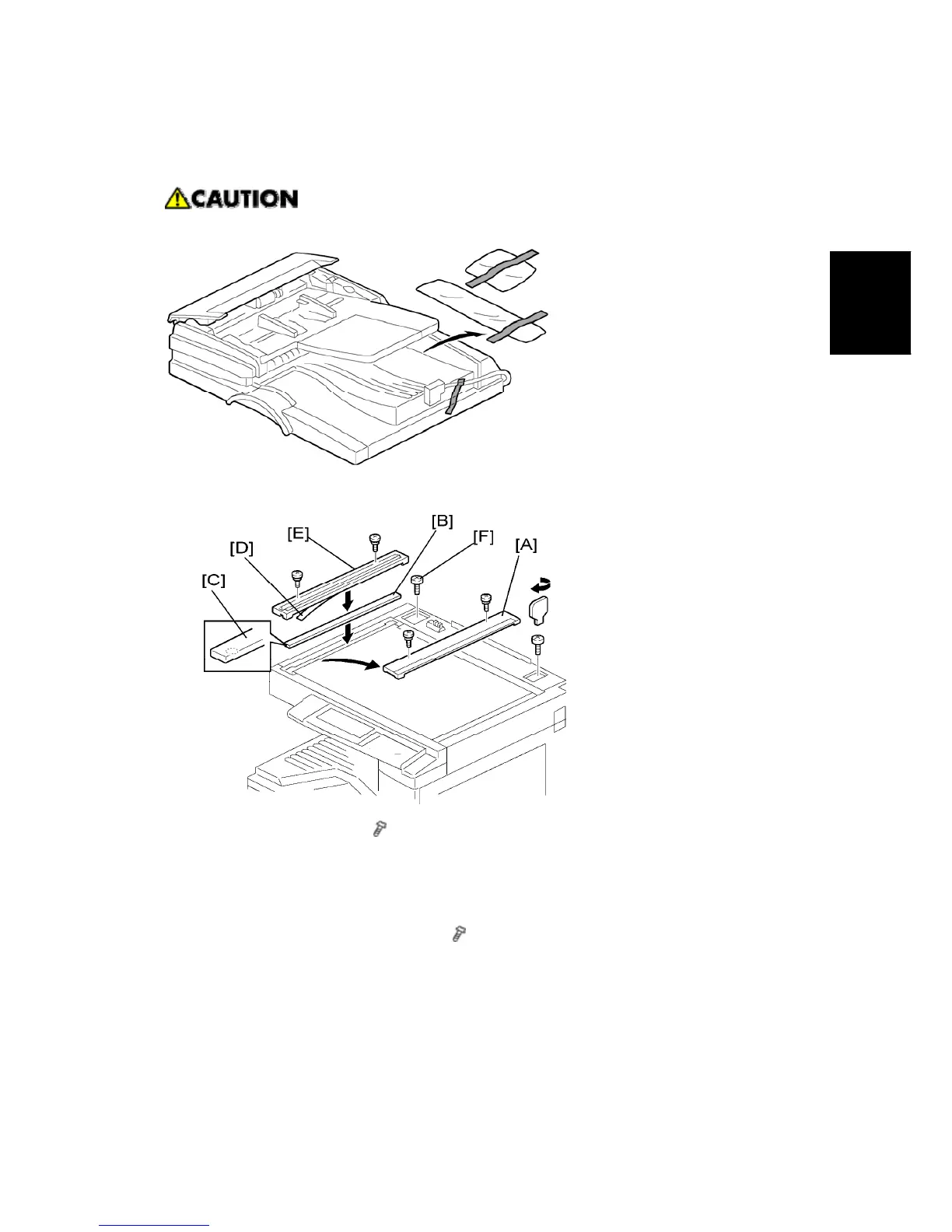 3. Place the DF exposure glass [B] on the glass holder. Make sure that the white mark [C]